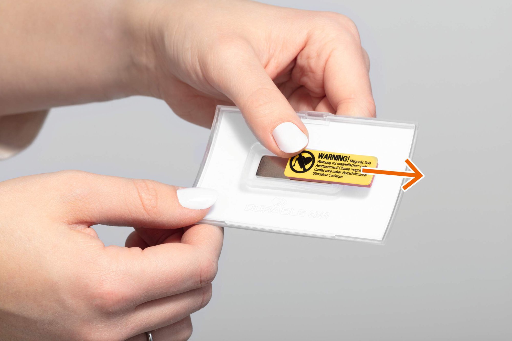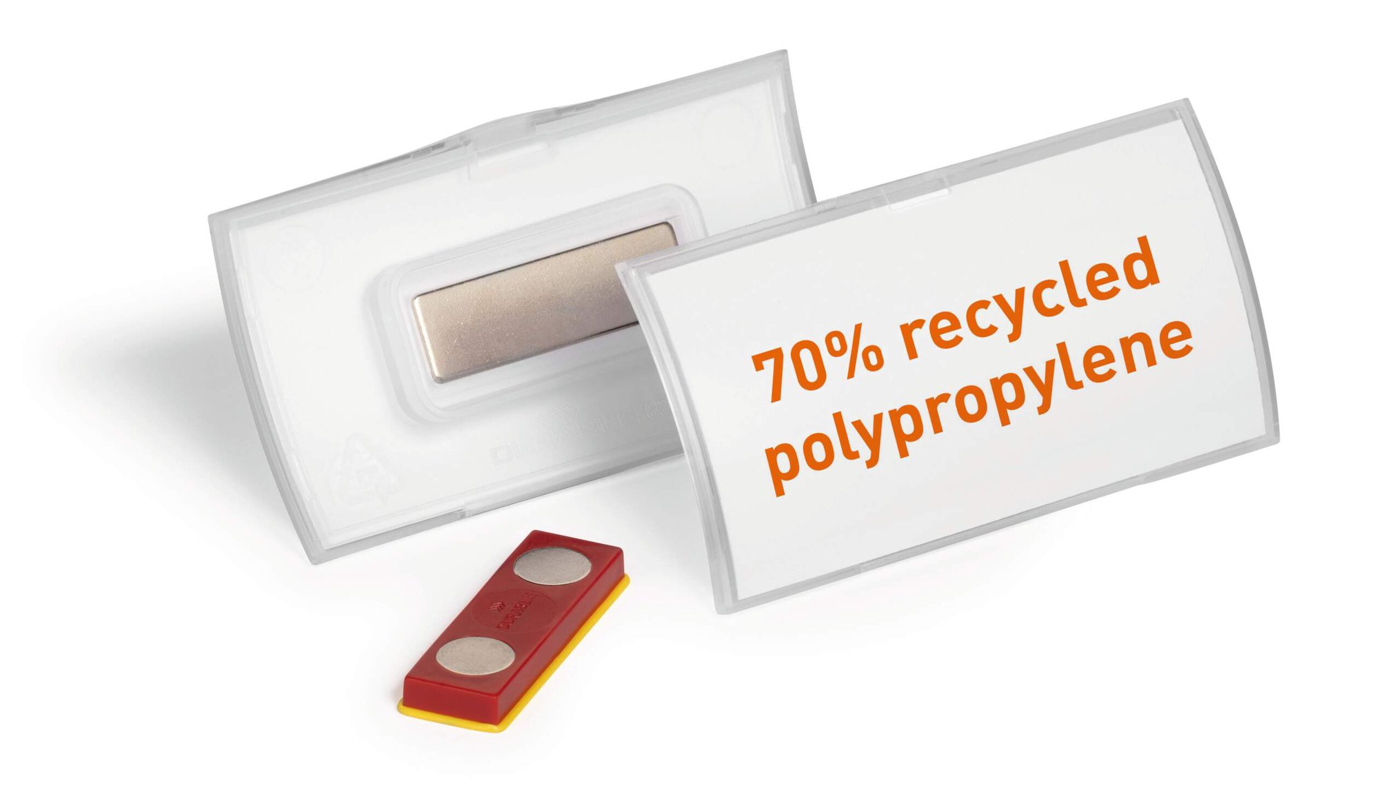 Modern frameless name badges made with recycled plastic, perfect for use in conferences, trade fairs or seminars. They feature simple and secure anti-slip magnetic fastenings that won€™t damage even delicate fabrics. Kind to the planet and your cloths.<br><br>Say goodbye to fiddling with inserts thanks to our unique convex CLICK FOLD design.<br><br>Made with over 70% recycled polypropylene, 100% recyclable and environmentally friendly in accordance with ISO 14021.<br><br>Provided with 10 pre-cut blank insert cards<br>Compatible with printable inserts (product # 145302)<br><br>Insert size: 40 x 75 mm<br>Pack size: 10<br><br>Made in Germany and built to last