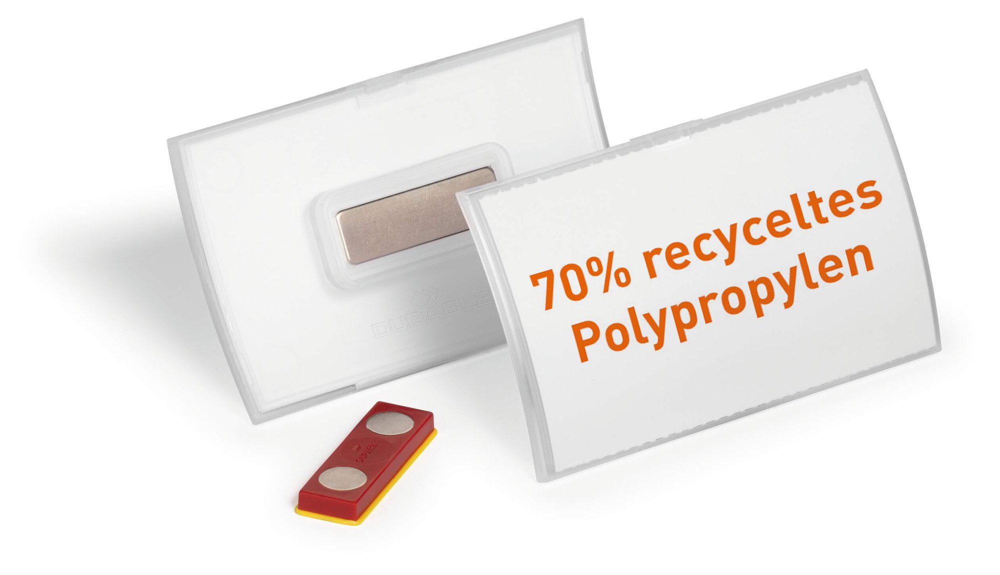 Modern frameless name badges made with recycled plastic, perfect for use in conferences, trade fairs or seminars. They feature simple and secure anti-slip magnetic fastenings that won€™t damage even delicate fabrics. Kind to the planet and your cloths.<br><br>Say goodbye to fiddling with inserts thanks to our unique convex CLICK FOLD design.<br><br>Made with over 70% recycled polypropylene, 100% recyclable and environmentally friendly in accordance with ISO 14021.<br><br>Provided with 10 pre-cut blank insert cards<br>Compatible with printable inserts (product # 145502)<br><br>Insert size: 54 x 90 mm<br>Pack size: 10<br><br>Made in Germany and built to last