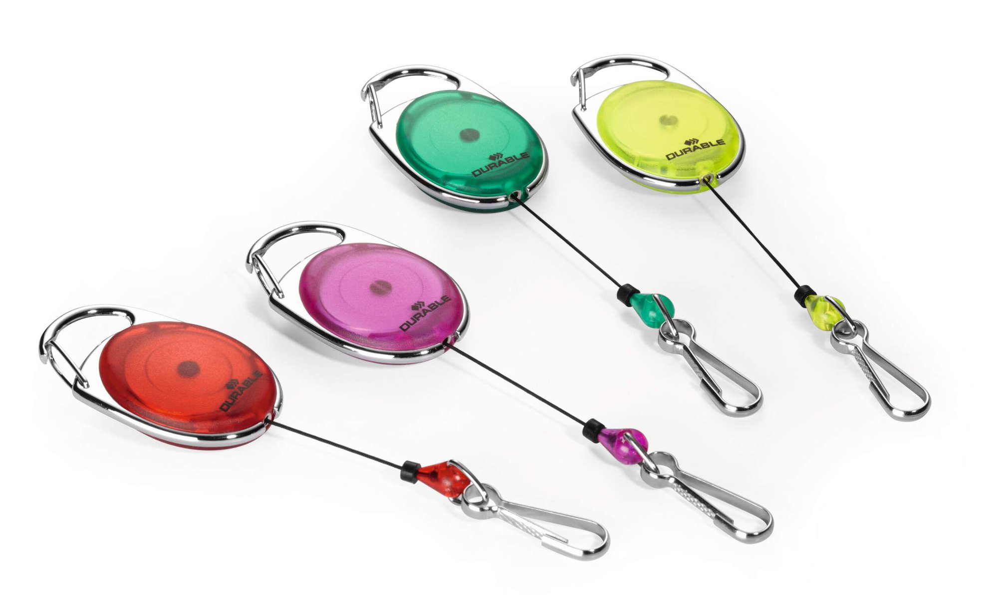Modern translucent badge reels with key ring clip Compatible with keychains and punched hole name badges. The reel features a secure carabiner for attaching to pockets or belts. Perfect for workplaces with high levels of security.<br><br>Made in Germany and environmentally friendly in accordance with ISO 14021: includes 10% recycled materials and is 100% recyclable.<br><br>Reel length: 80 cm<br>Supported weight: 20 g<br><br>Designed in Germany and built to last