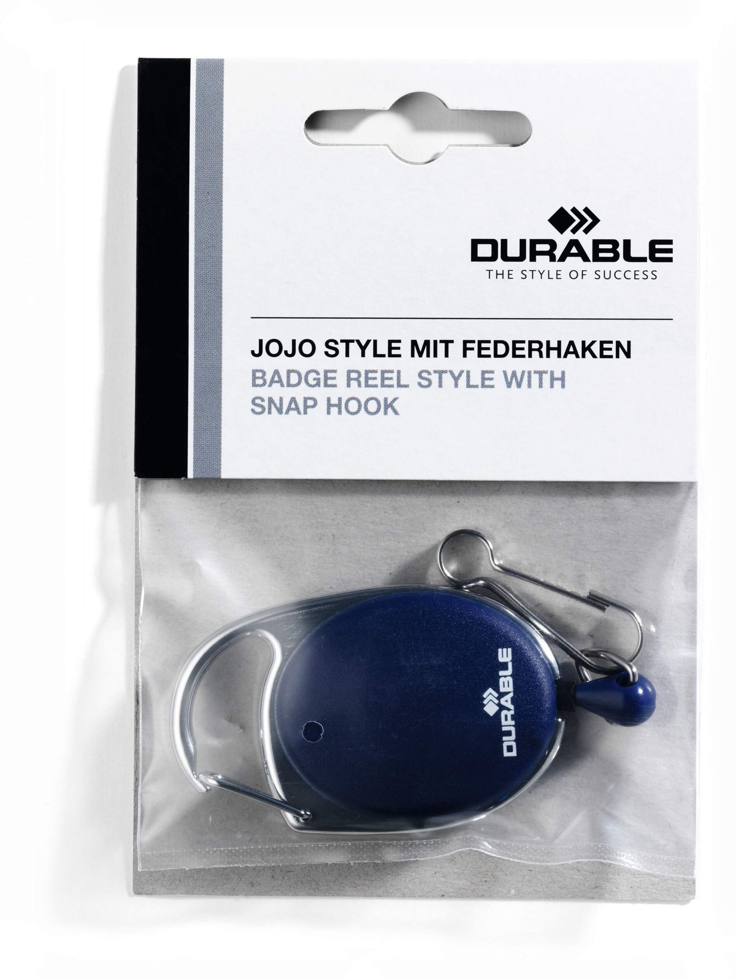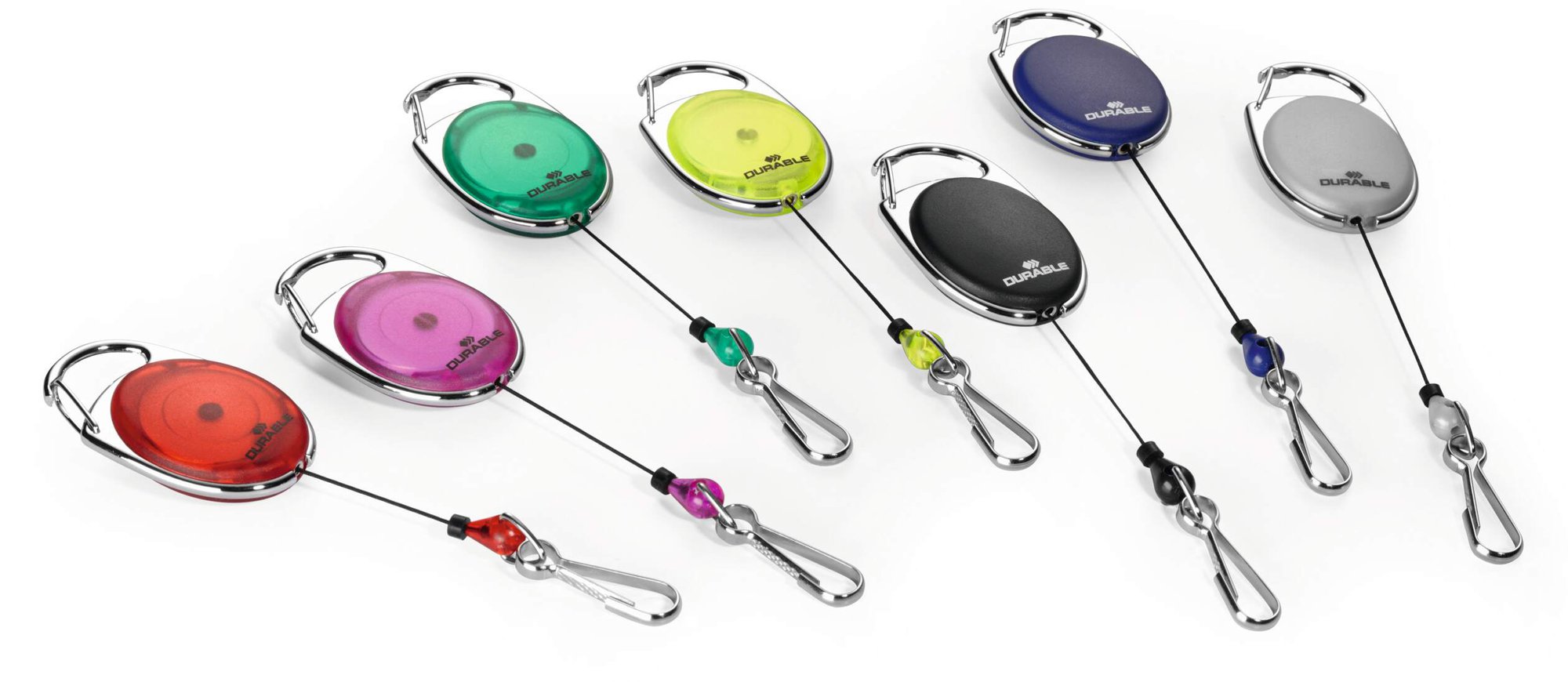 Modern translucent badge reels with key ring clip Compatible with keychains and punched hole name badges. The reel features a secure carabiner for attaching to pockets or belts. Perfect for workplaces with high levels of security.<br><br>Made in Germany and environmentally friendly in accordance with ISO 14021: includes 10% recycled materials and is 100% recyclable.<br><br>Reel length: 80 cm<br>Supported weight: 20 g<br><br>Designed in Germany and built to last