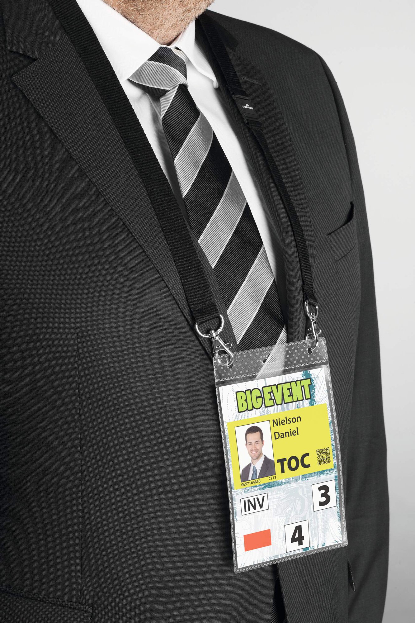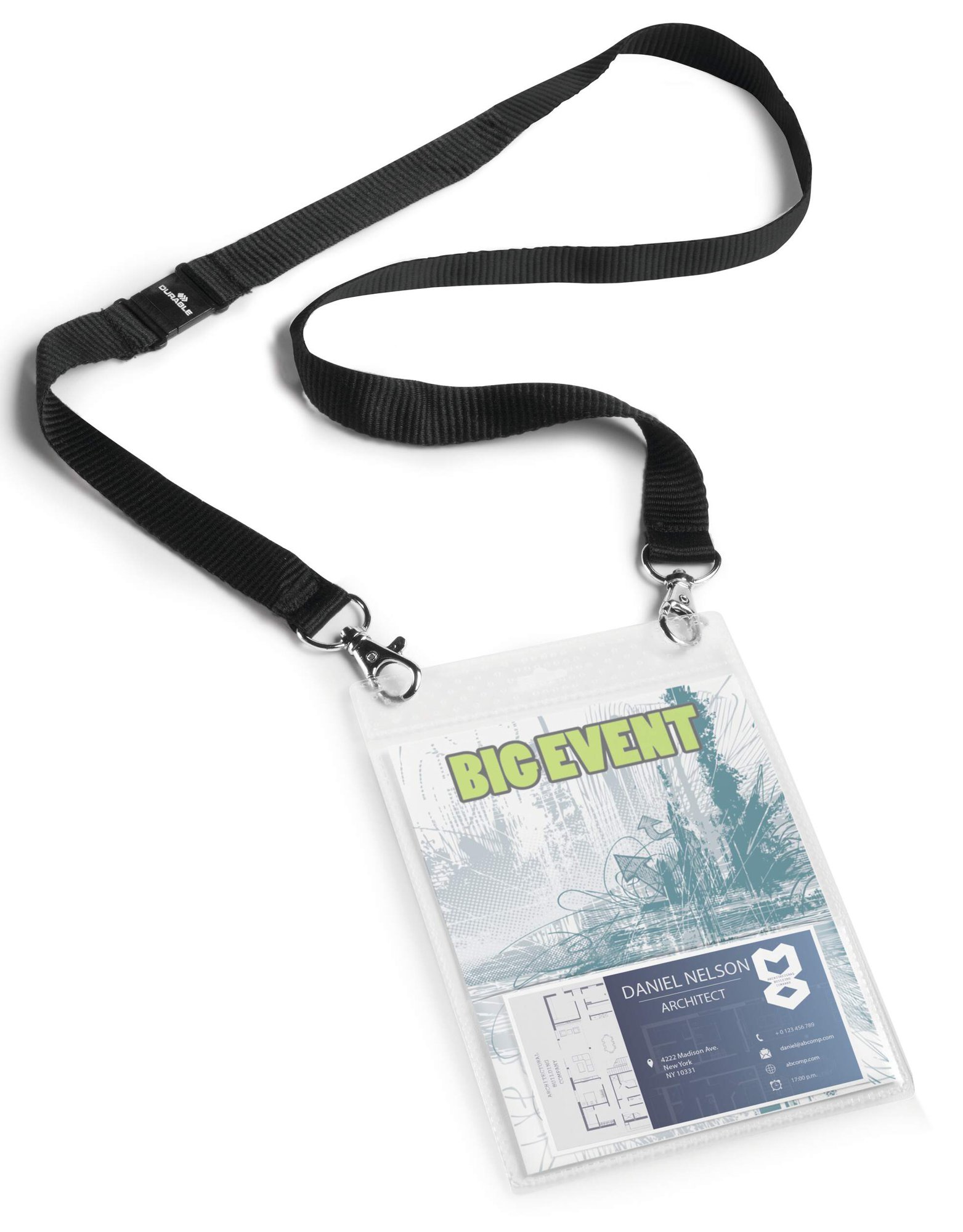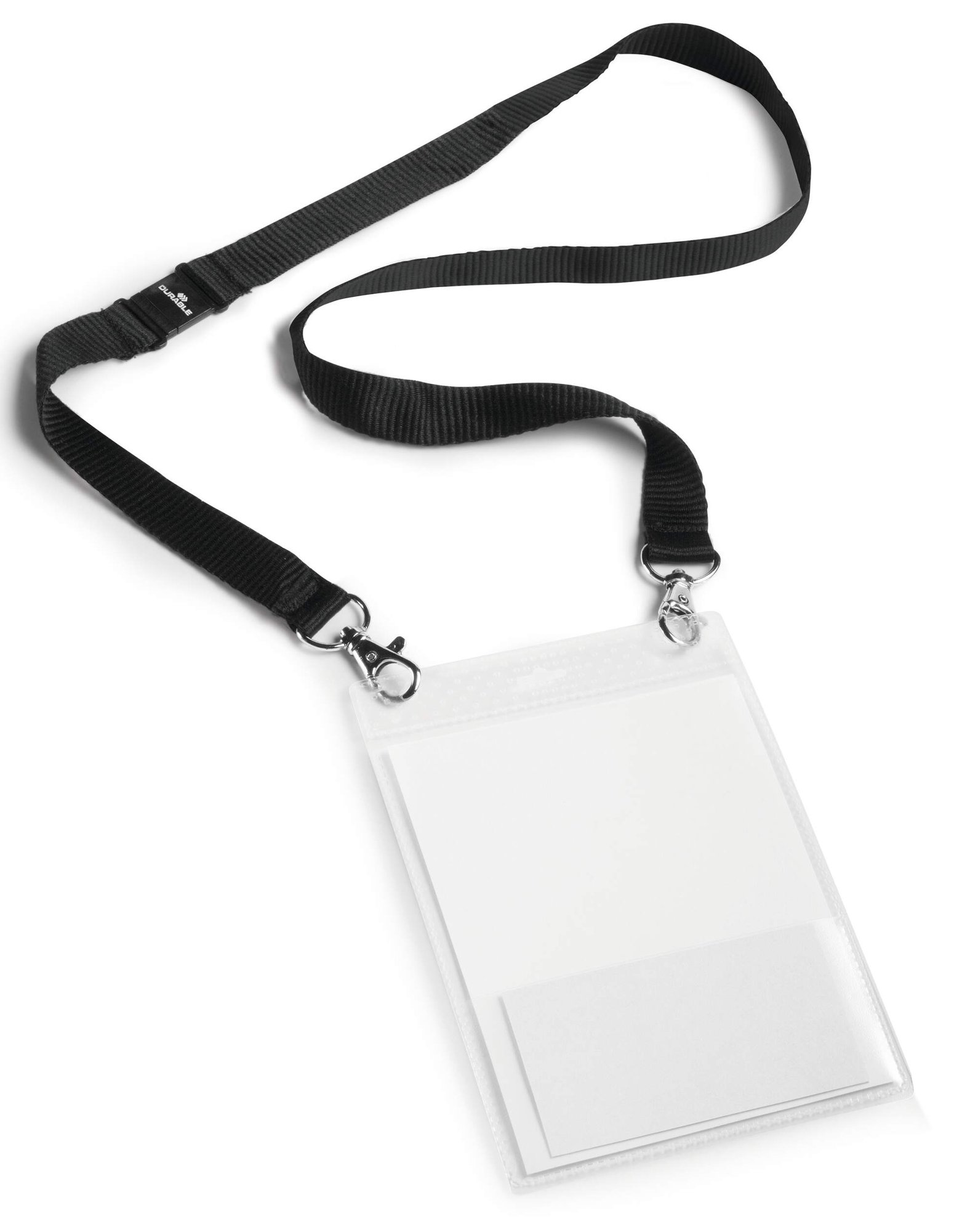 Durable lanyards are made of soft high quality fabric and feature safety releases to protect the user from snagging.<br><br>Our crystal clear transparent name badges are made of premium anti-tear plastics for increased durability. They feature an extra pocket for business cards and name badges<br><br>Provided with our free online name badge design software DURAPRINT with database functionality, saving you both time and money.<br><br>Environmentally friendly in accordance with ISO 14021: 100% recyclable.<br><br>Provided with 10 pre-cut blank insert cards<br>Compatible with printable inserts (product # 142002)<br><br>Made in Germany<br>Lanyard length: 88 cm<br>Insert size: Portrait A6 (105 x 149 mm)<br>Pack size: 10