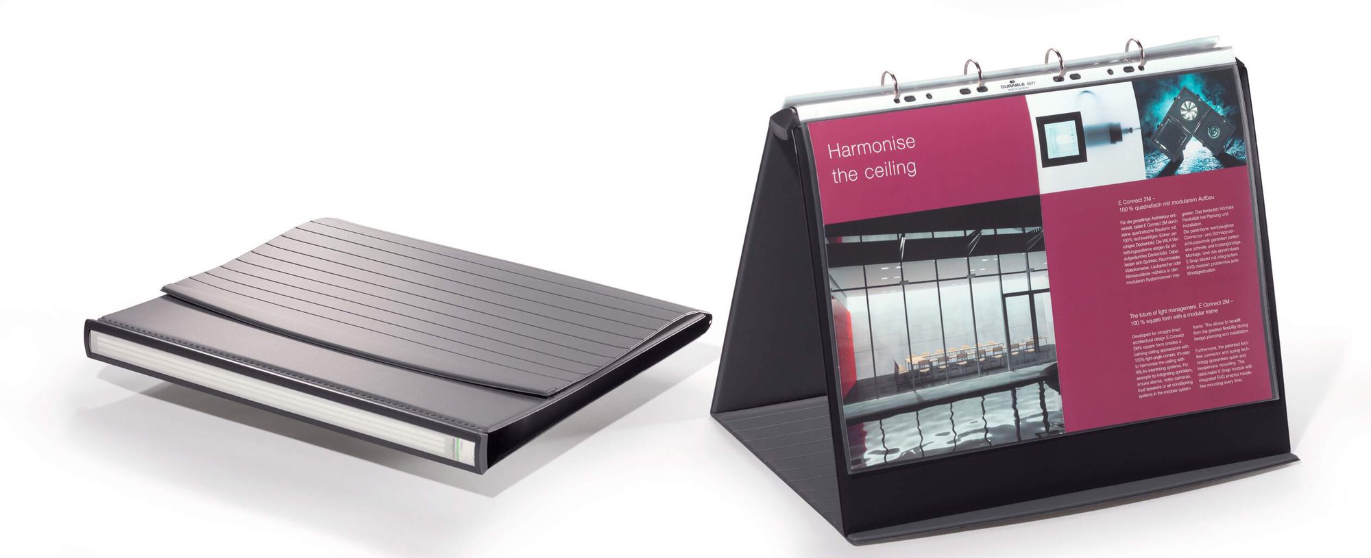 A range of high-quality and stylish presentation table flipcharts. They provide great versatility and can be used for trade fairs, exhibitions, training courses and presentations etc. The quality of this range is evident through the soft ribbed metallic grey PVC material. Provided with a unique removable spine label for the easy identification of all presentations.<br><br>All our flipcharts are built in-house in Germany. They are made to a high standard from premium quality plastics and undergo strict quality control<br><br>Comes with 10 low-reflection, premium-quality punched pockets with reinforced holes (expandable to 30+)<br><br>Size: 450 x 360 x 320 (H x W x D)
