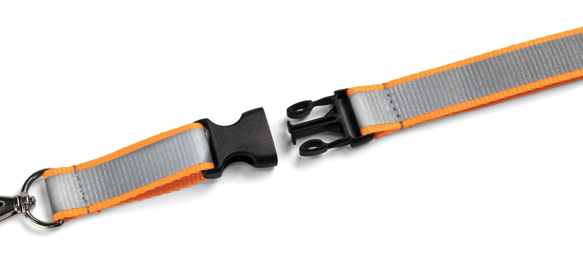 Textile lanyard with a large reflective surface in safety orange for increased visibility in lowlight and hazardous situations. Includes a built-in safety release protecting the user if the strap becomes caught or trapped.<br><br>There is an integrated detachable strap with a snap hook so that keys and passes can be easily used without having to take off the lanyard.<br><br>Made in Germany and environmentally friendly in accordance with ISO 14021: 100% recyclable.<br><br>Kind to the planet and built to last.<br><br>Width: 2 cm<br>Length: 53 cm<br>Quantity: 1