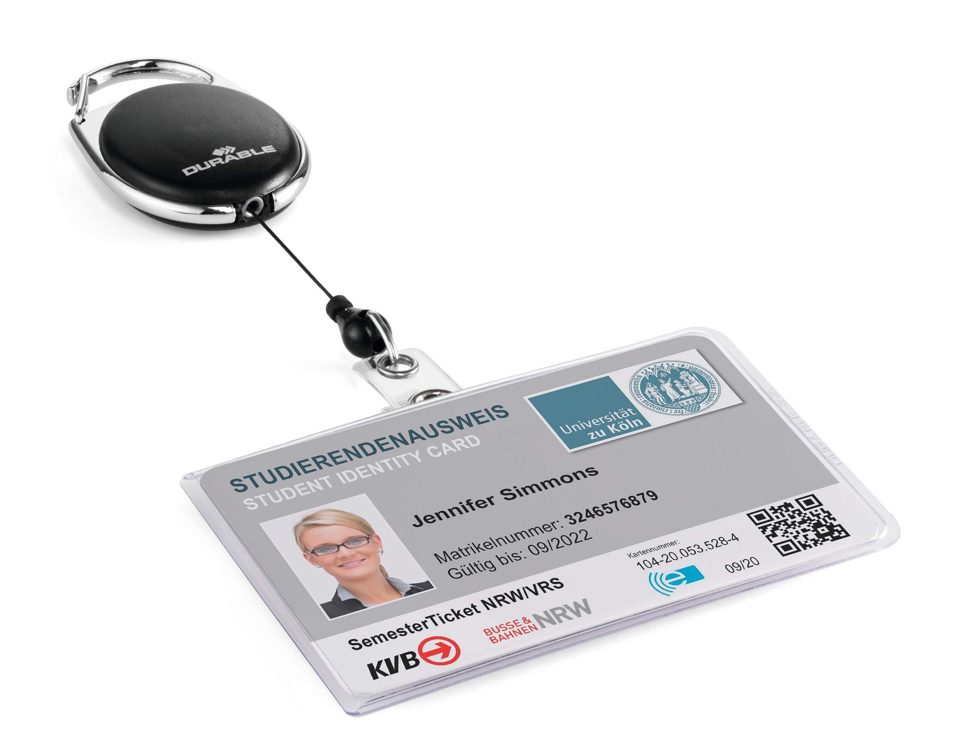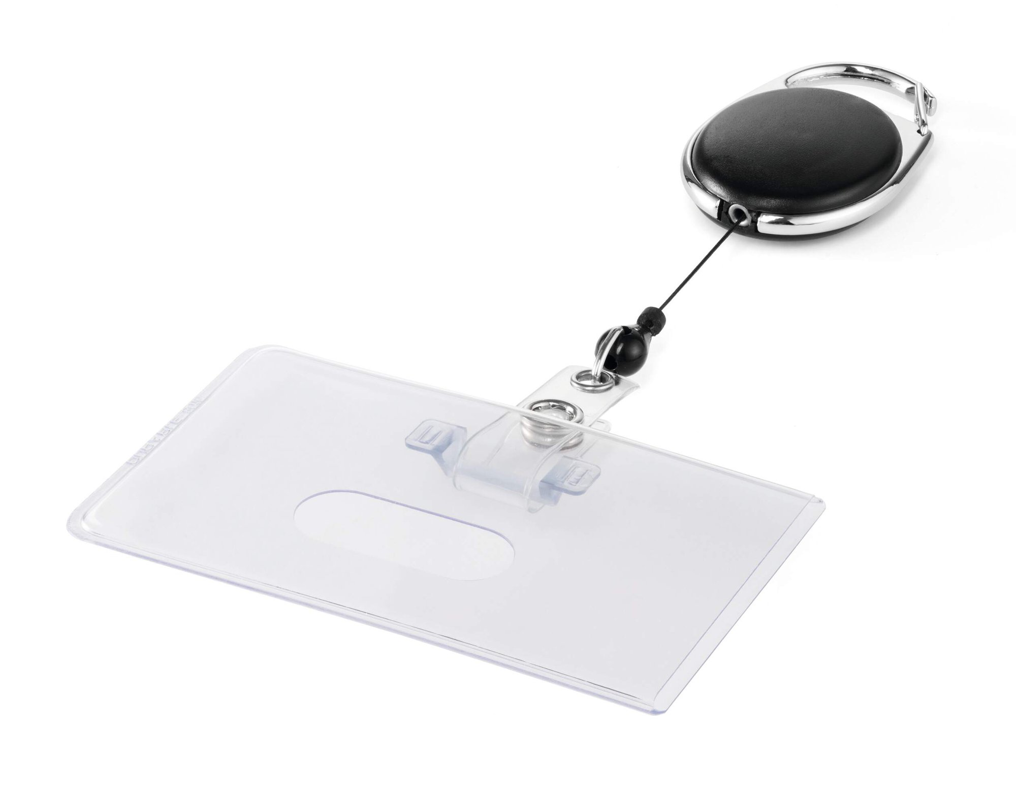 Stylish German-designed ID card holder with secure smooth operating badge reel. The reel features a secure integrated carabiner for attaching to belt loops, perfect for workplaces with high levels of security.<br><br>Say goodbye to fiddling with labels with our ergonomic thumb slot making removing badges a breeze<br><br>Made of 100% recyclable materials<br><br>Reel length: 80 cm<br>Supported weight: 20 g<br>Insert dimensions: 54 x 87 mm<br>Quantity: 1<br><br>Designed in Germany and built to last