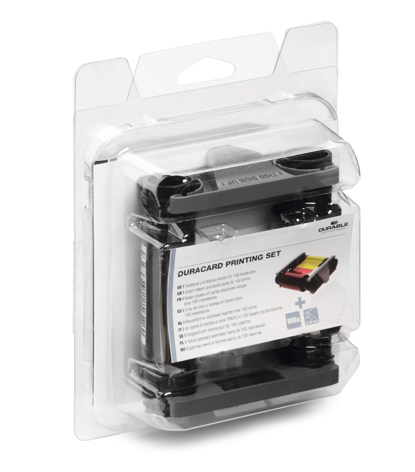 Durable YMCKO Full colour ribbon and 100 thick plastic card set for high quality 300 dpi printing. A transparent protective coating in the ribbon provides the cards with an additional seal for durability and water resistance. <br><br>The ribbon features RFID-encoding for quick colour recognition by the DURACARD ID 300 printer. Inserting cards and changing ribbons is made easy thanks to unique German design.<br><br>Reliable, high quality, and environmentally friendly in accordance with ISO 14021: 95% recyclable.<br><br>Includes<br>YMCKO Full colour ribbon with protective overlay<br>100 Premium PVC blank white cards<br><br>Colour: Full colour YMCKO (CMYK plus a protective overlay)<br>Printing Technology: Sublimation printing<br>Ribbon yield: 100 Cards<br>Card thickness: 0.76mm<br>Card format: 53.98 x 85.60 mm (Standard)
