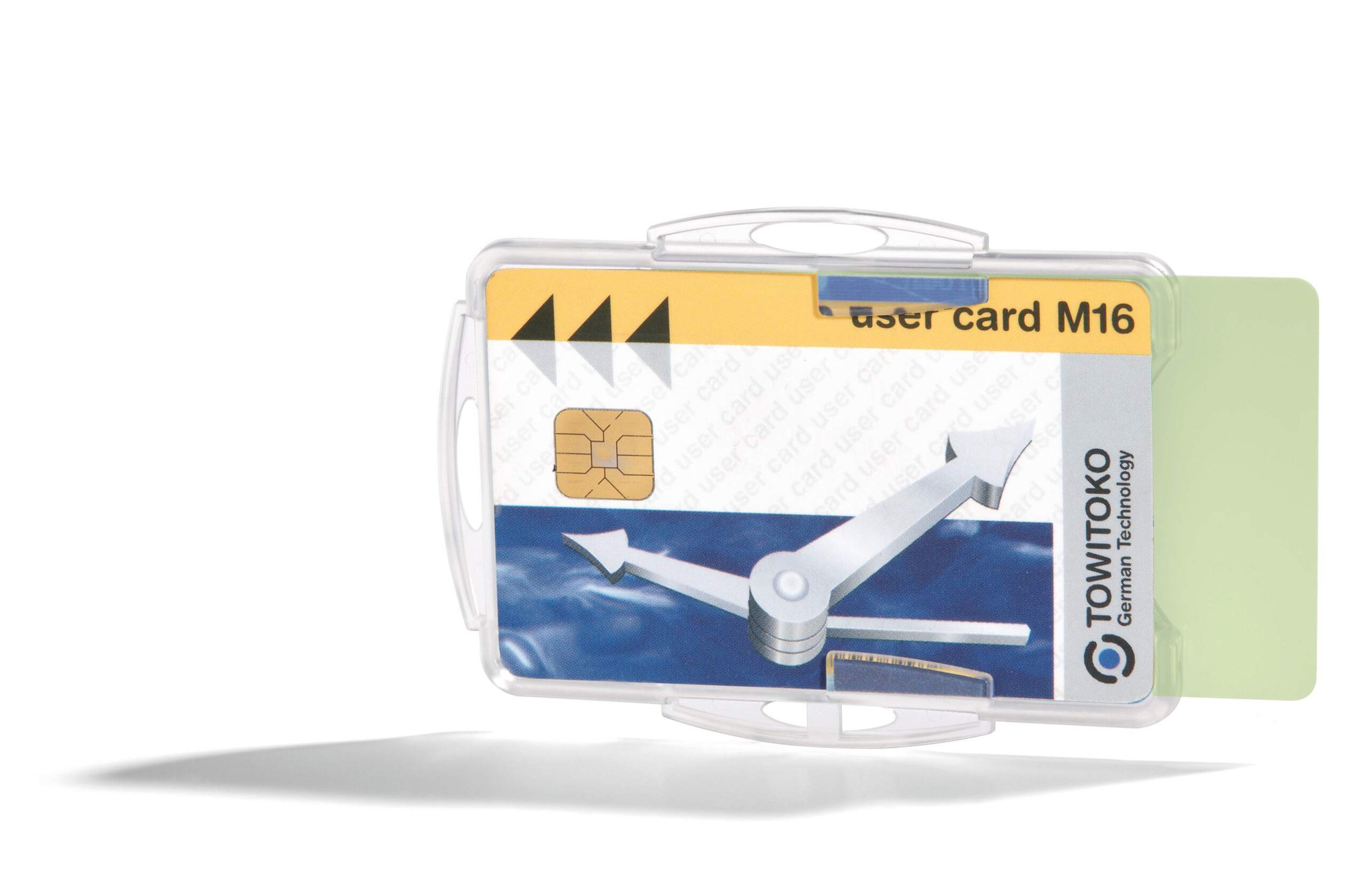 Our German-designed badge holders securely hold IDs without damaging the magnetic strip. The unique end stoppers to keep your card safe while remaining easy to exchange. <br>They feature secure portrait and landscape fastenings for lanyards, chains and badge reels.<br><br>Made in Germany and environmentally friendly in accordance with ISO 14021: 100% recyclable.<br><br>Kind to the planet and built to last.<br><br>Orientation: Landscape and Portrait<br>Supports cards up to: 54 x 87mm (standard credit card)<br>Capacity: 2 cards<br>Quantity: 10
