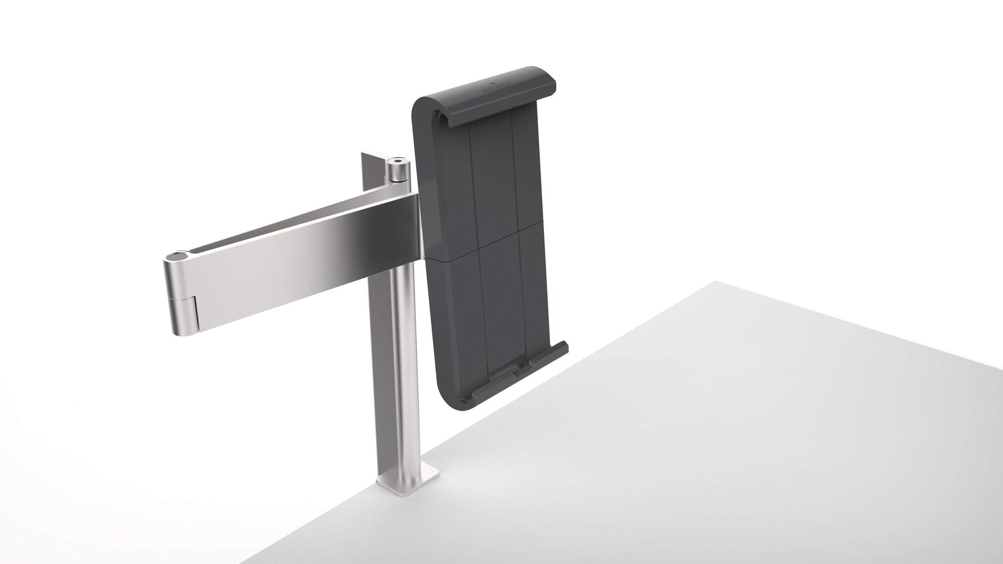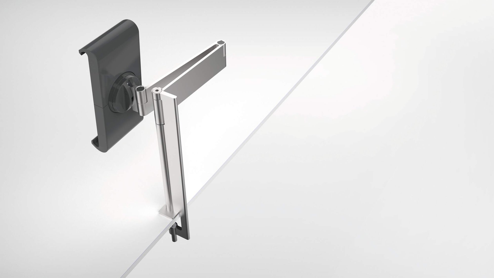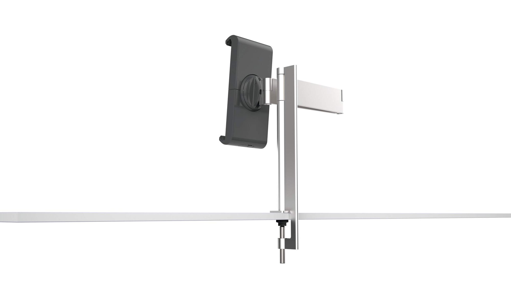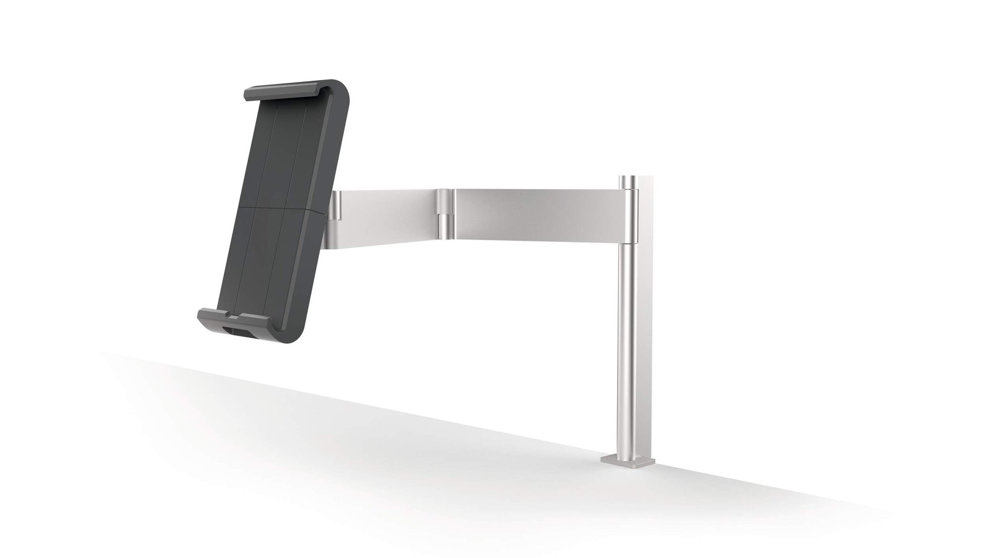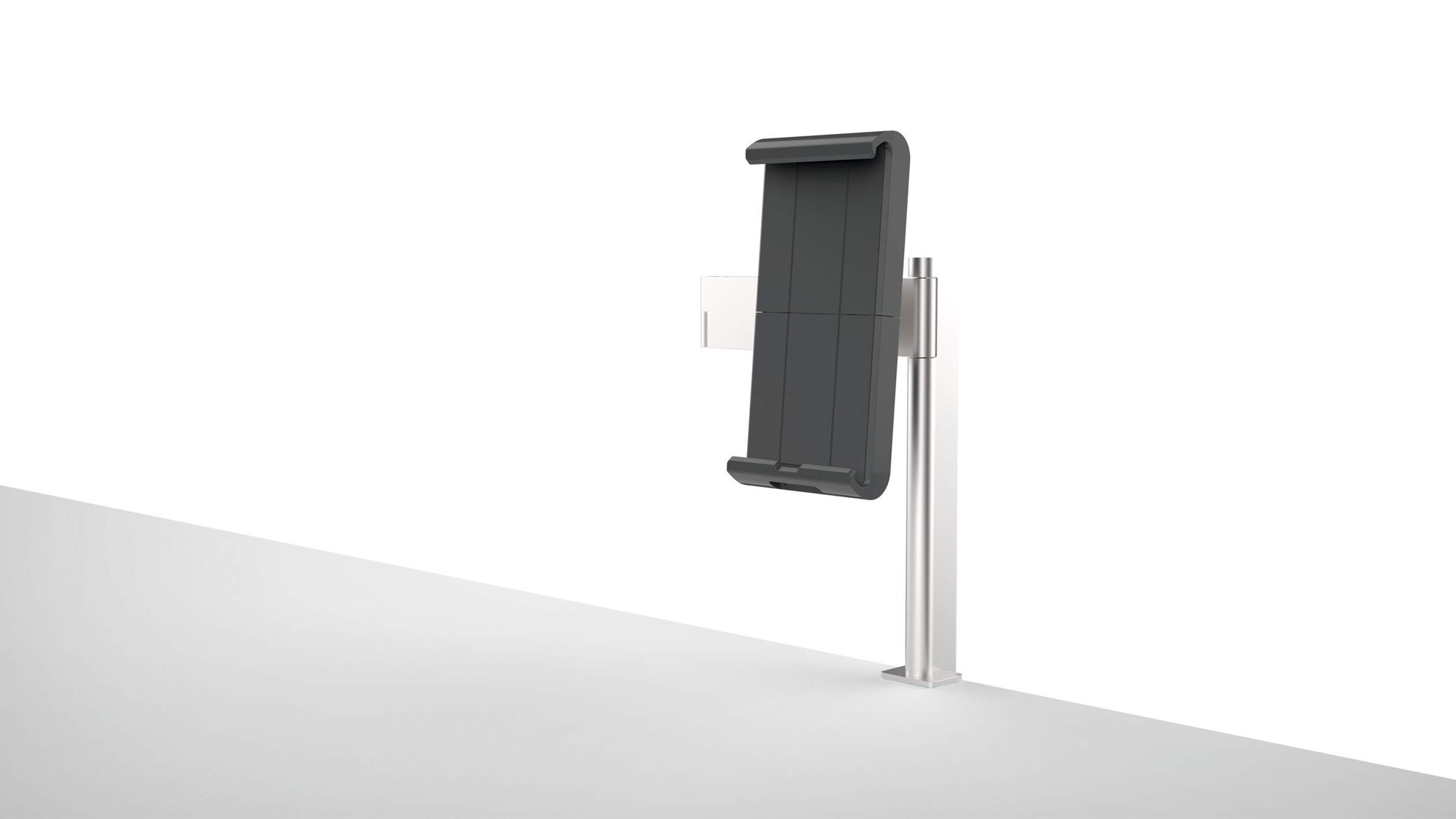 A modern and stylish table clamp tablet holder in Silver which is perfect for any environment. The tablet holder securely holds tablets from 7 to 13" and includes an anti-theft system to prevent unauthorised removal of the tablet. The clamp securely holds the tablet in place and is rotatable 360° for use in both portrait and landscape format.<br><br>The tablet holder has a tilt angle range of -6° to +46° for Compatiblelete flexibility. The arm has a radius of 365mm and a swivel range of 180°. Perfect for use in hotels