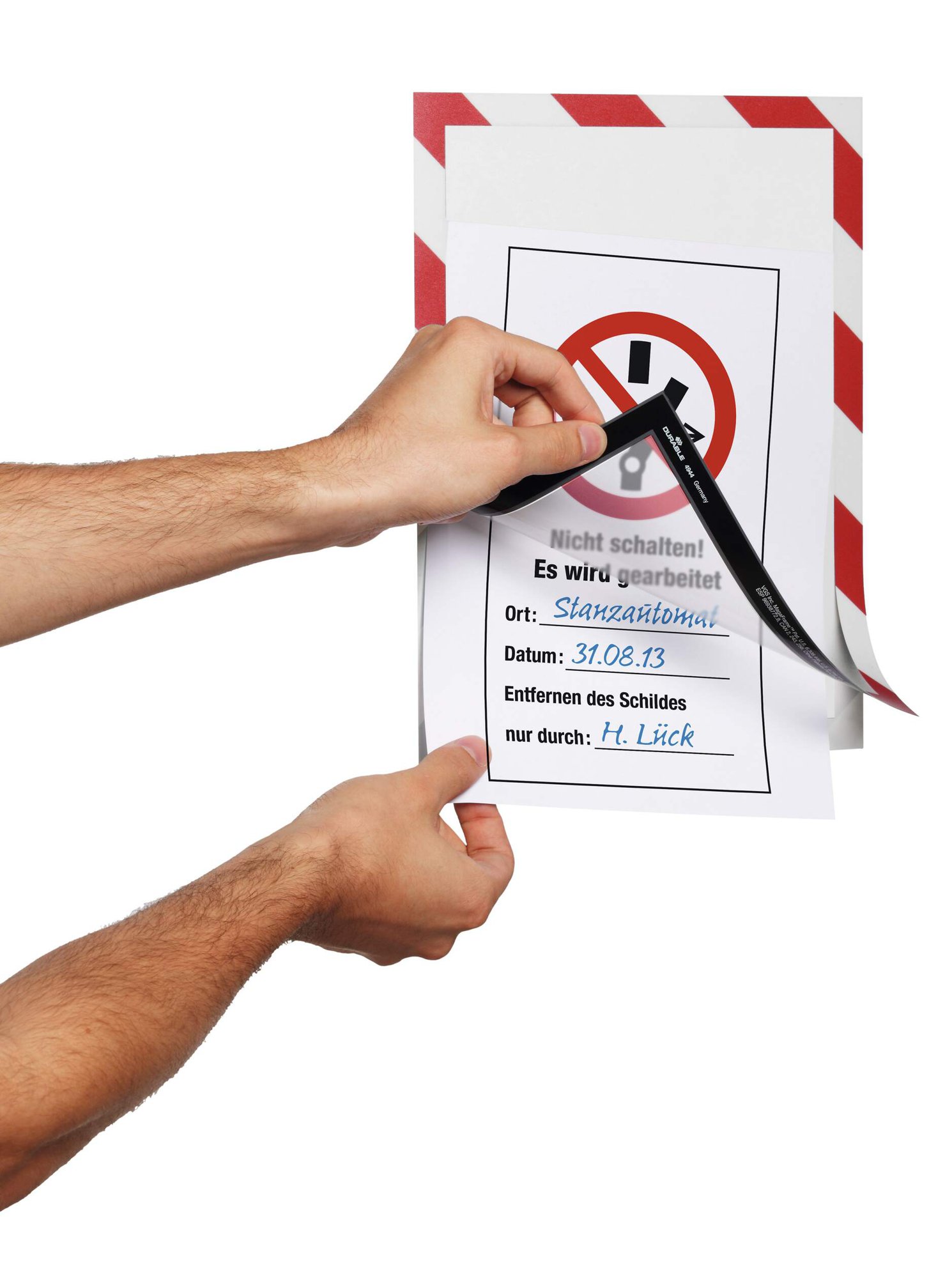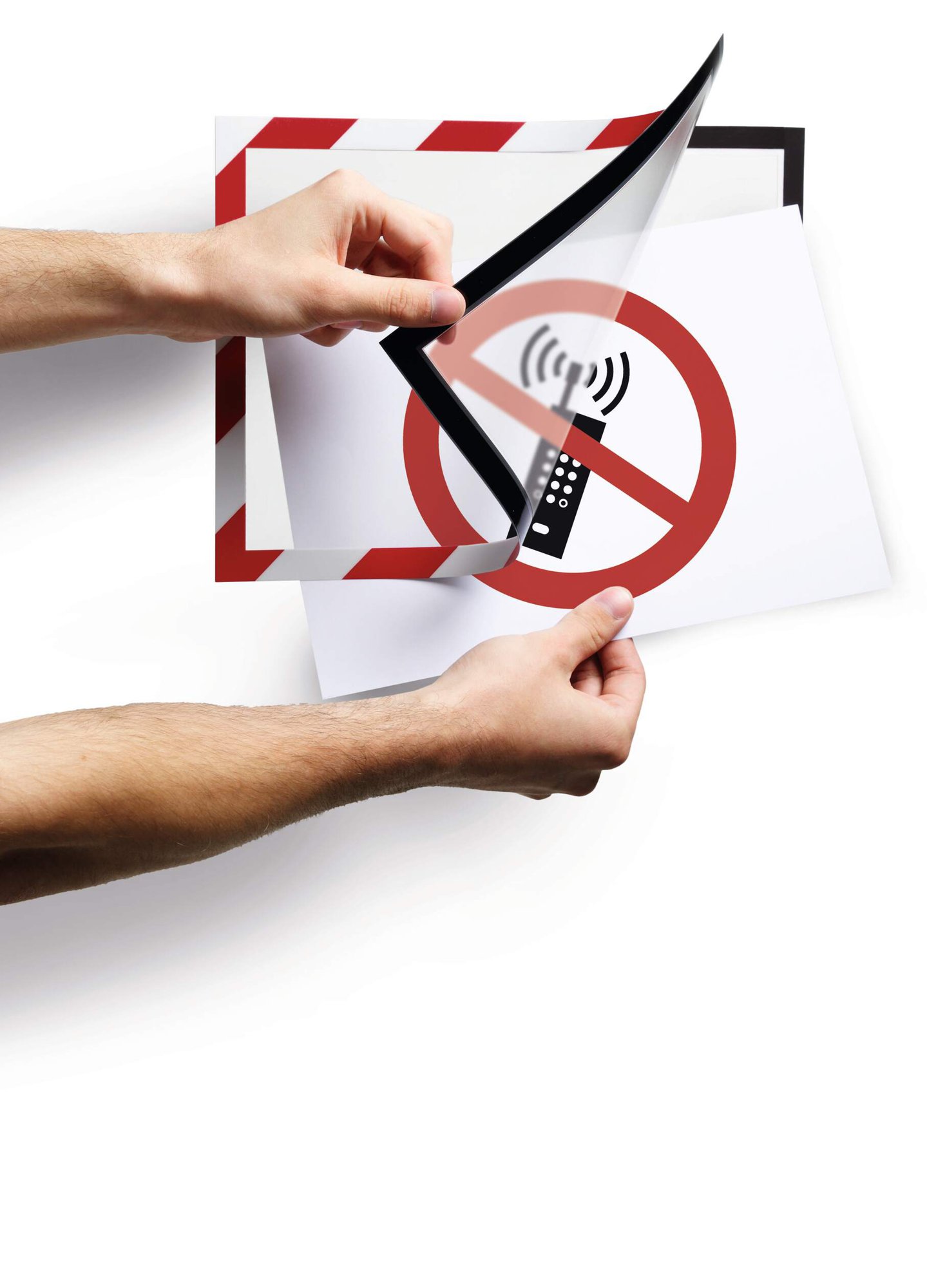 The self-adhesive, twin-coloured info frame DURAFRAME SECURITY is the ideal solution for displaying safety signs in A4 format on solid and smooth surfaces. The inserts can be quickly exchanged thanks to the unique magnetic fold-back frame.<br><br>When applied to glass, the information can be read from both sides and will leave no residue when removed. Perfect for displaying safety signs such as wet floor, no smoking etc. in production areas, warehouses and offices.