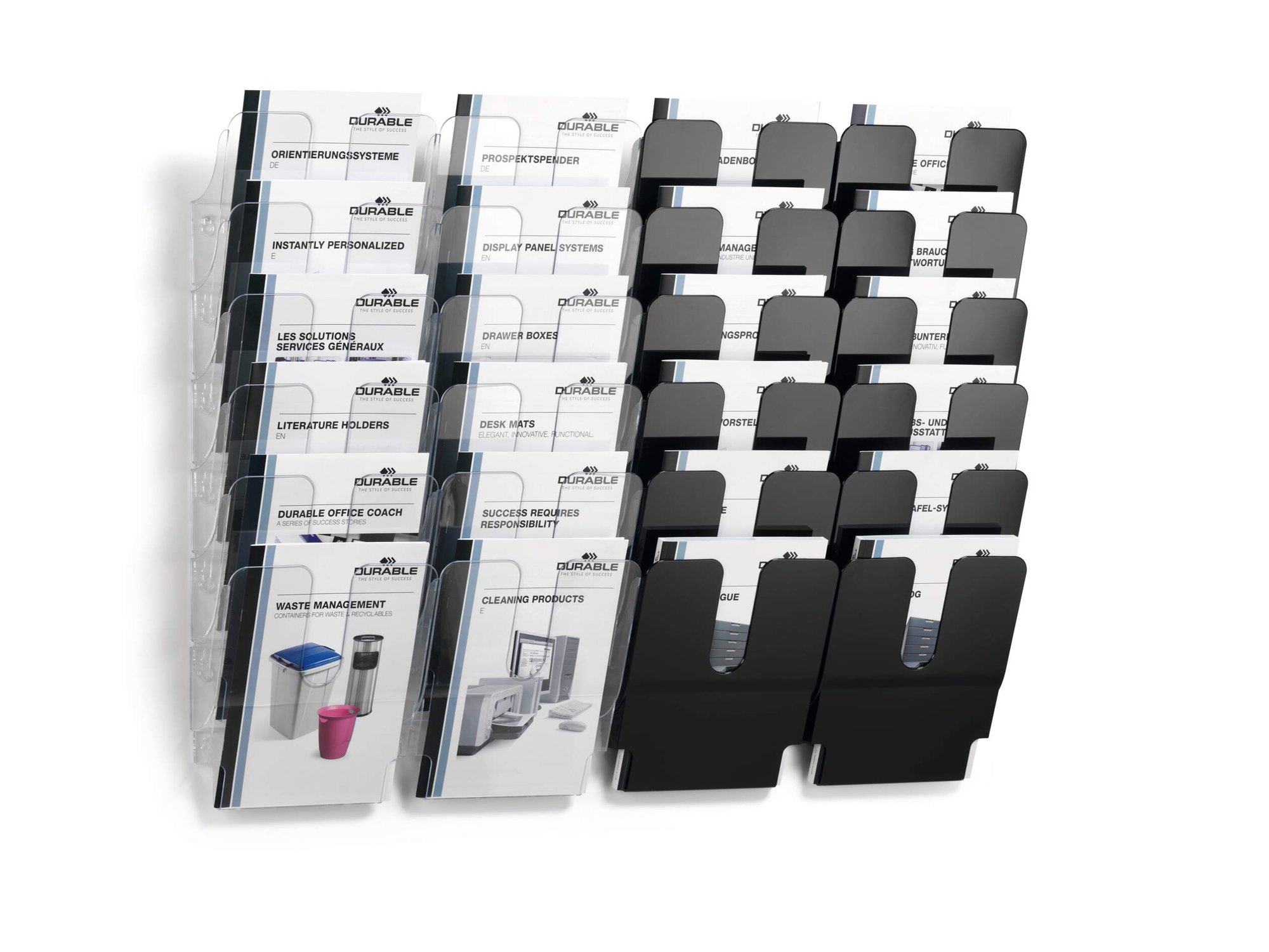 Set of 6 modular literature holders perfect for displaying and presenting documents in A4 format. Made of strong plastic and can be installed and mounted to flat load-bearing surfaces in a matter of moments. The document holder can be easily extended to add further slots for a flexible future-proof solution<br><br>All our literature holders are built and designed in-house in Germany. They are made to a high standard from premium quality plastics and undergo strict quality control. This provides a great finish and extended product lifecycle.<br><br>Dimensions: 1080 x 247 x 23 mm (H x W x D)