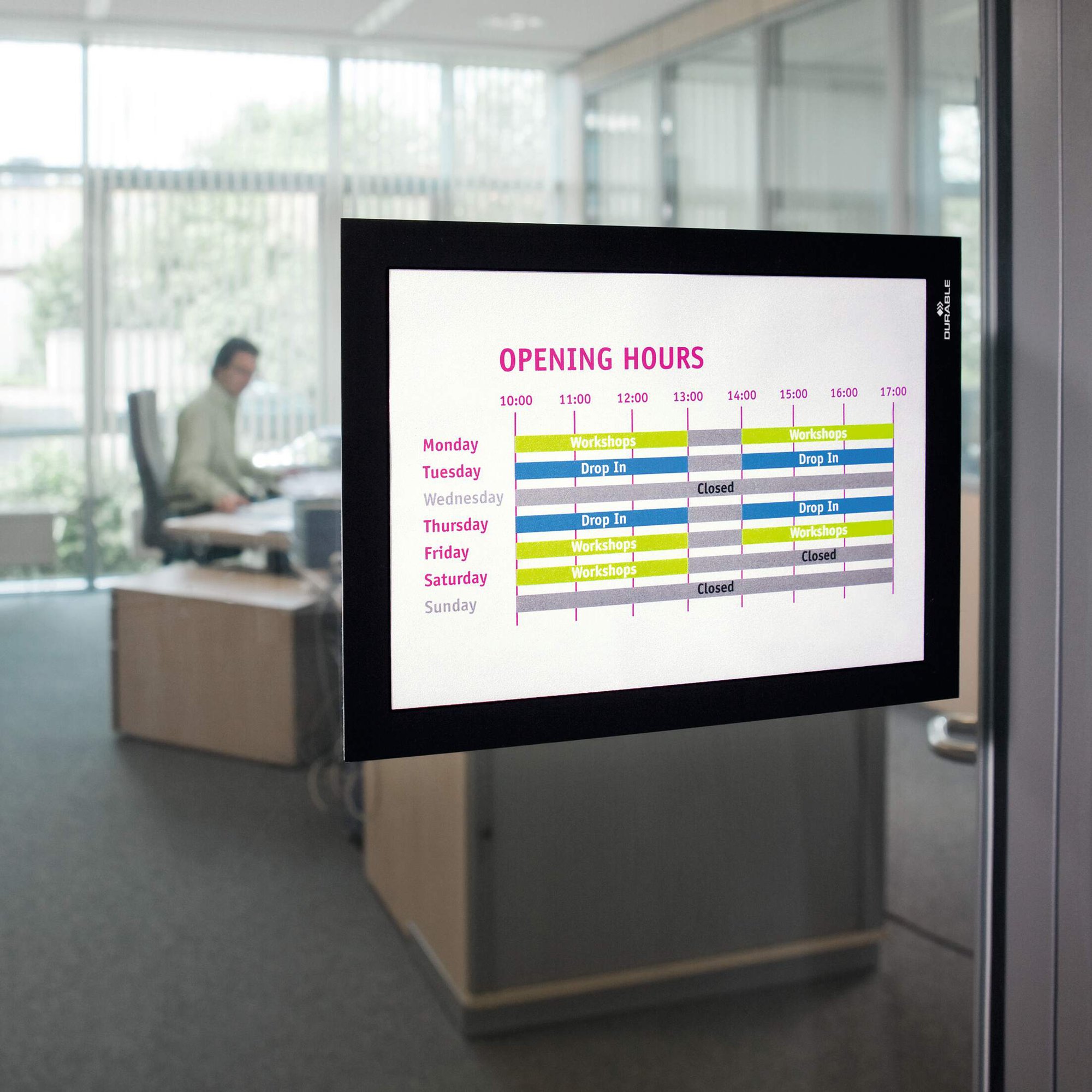 DURAFRAME €“ the ultimate solution for displaying documents and notices with style and ease. Effortlessly swap inserts by simply lifting the magnetic frame, making updates quick and seamless. Designed in Germany and crafted in Europe, DURAFRAME is the UK's top choice for a reason.<br><br>Perfect for showcasing essential information such as notices, promotions, timetables, health & safety guidelines in either portrait or landscape format.<br><br>This versatile solution is popular in Retail, Offices, Education, Healthcare, Warehouses and Production Facilities alike.<br><br>Why choose DURAFRAME, the trusted original?<br>Professional, eye-catching display: Boldly coloured frames with discreet magnetic strips for a clean, sleek look.<br>Clear visibility: The frame's window ensures the entire document is easily readable.<br> Reposition & Reuse: The self-adhesive backing can be applied to any surface and be removed with no residue<br>Great on Glass: UV Protection and identically coloured frame on both sides gives you a double sided signage solution<br>Built to last: Made from premium, durable materials that protect your documents from wear and tear.<br>Maximum hold: Wider magnetic strips on all sides keep documents securely in place.<br>Enhanced protection: Magnetic seal on all sides helps guard against damage from dust, liquid, and daily use.<br>Durability meets performance: Anti-glare, scratch-resistant coating ensures documents remain easy to read and protected over time.<br><br>DURAFRAME €“ your go-to for professional, secure, and long-lasting document display.