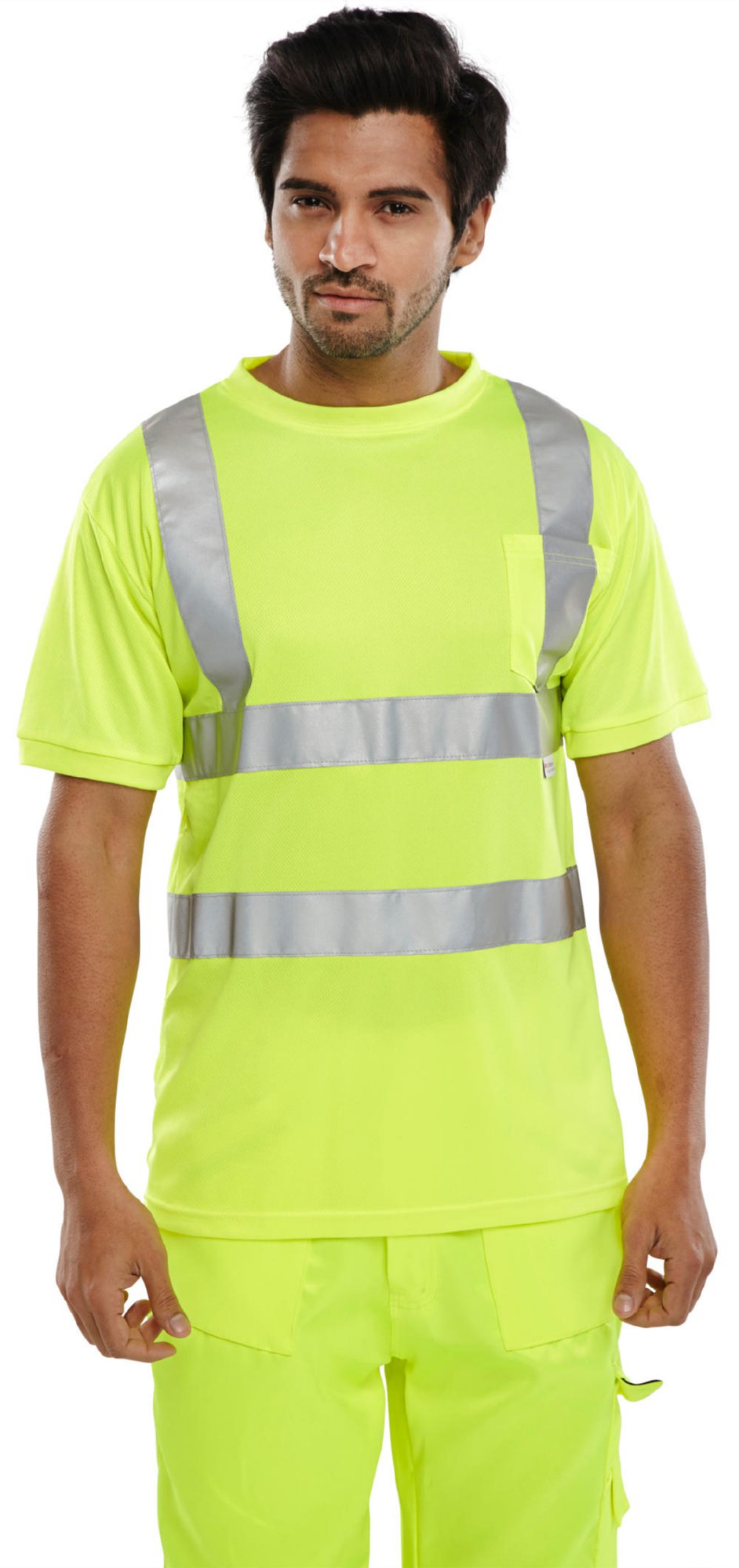 High visibility tee shirt, 100% Bird Eye Polyester fabric, Reflective tape, Left breast pocket *Conforms to EN ISO 20471 Class 2