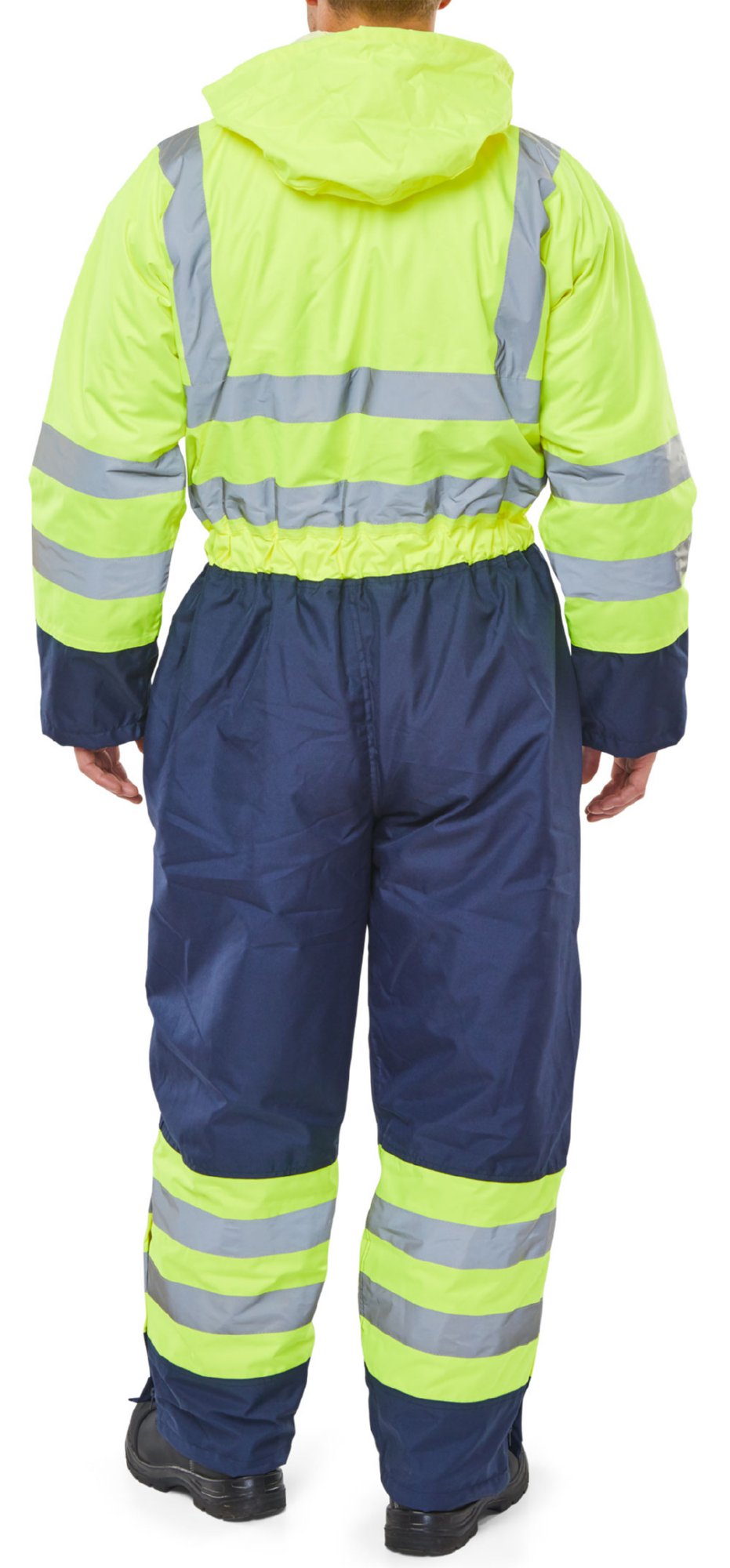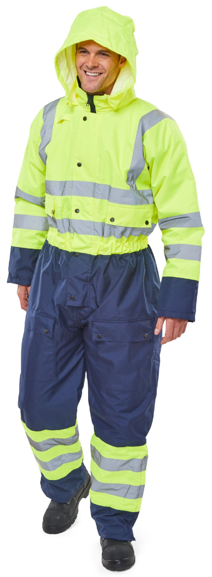 Two Tone Quilted Coverall, 300 Denier outer fabrics with sewn on tape. Heavyweight 100% polyester with PU coating. Two-way heavy duty YKK zip, with stud fastened storm flap. 2 Front stud fastened pockets. 2 leg cargo pockets with stud fastening. Security and phone pockets. Rear hem access for ease of logo applications. Concealed Hood. Retro-reflective tape. Conforms to EN ISO 20471 - Class 3. Conforms to EN 343 - Class 3 1. Conforms to EN 342 - Icler 0.474 Air Permeability - Class 2