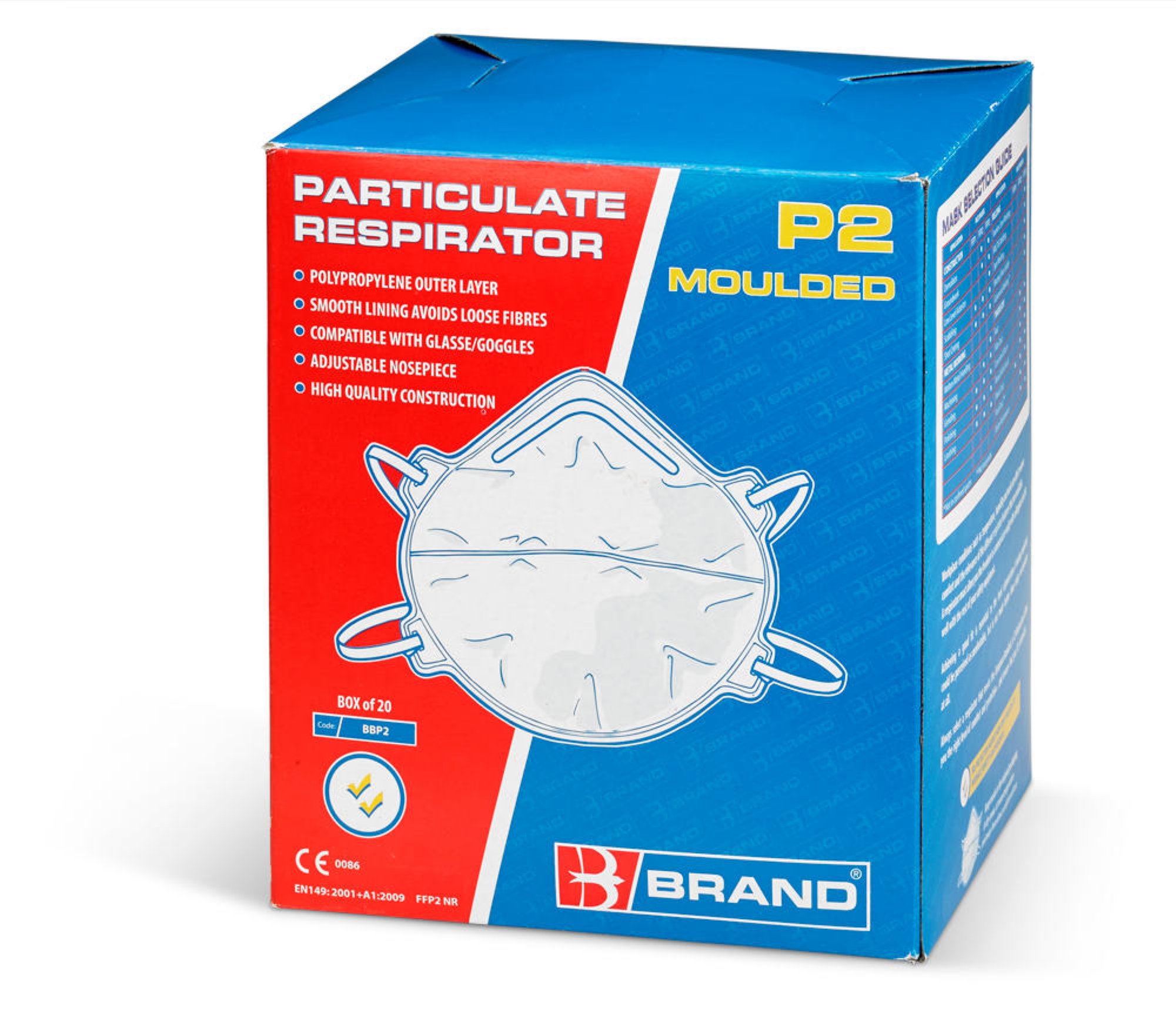 Polypropylene (P.P) outer layer provides smooth lining and avoids loose fibres. Embossed fringe seal avoids fluffy open layers around the edges. Latex free synthetic rubber head strap. Contour design ensures the Compatibleatibility of glasses / goggles and reduces fogging. Soft close-cell nose foam and adjustable nosepiece ensure custom shape and increase the worker comfort and acceptance. Conforms to EN149:2001 + A1:2009 FFP2 NR For Hazard Type: Toxic dusts, fumes and water-based mists. Example: Working with hardwood, glass fibres and plastic (non PVC) and some metalwork.