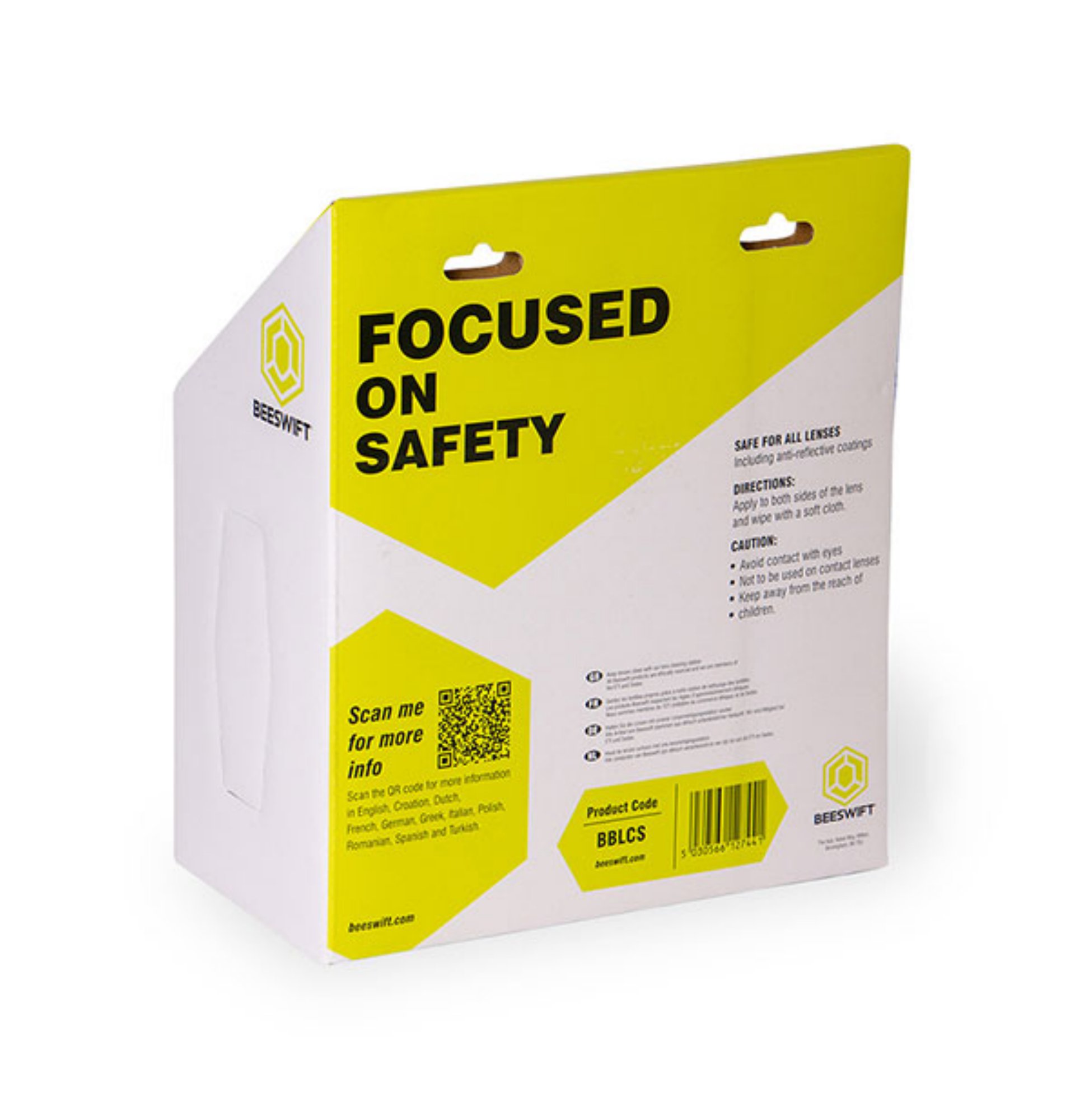 Conatains 600 tissues, 250ml bottle of lens cleaning fluid in pump dispenser. Tissues dispence from left and right sides, Stands freely or wall mountable, Not to be used with contact lenses