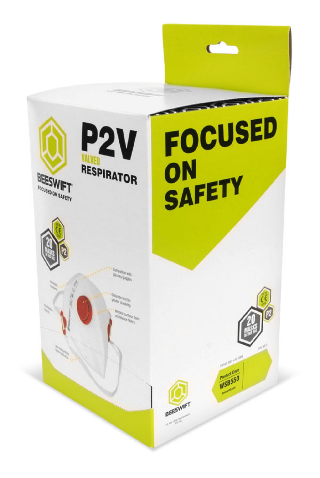 Vertical fold flat design. Comfortable face fit. Low breathing resistance. Conforms to EN149:2001 + A1:2009 FFP2 NR V For Hazard Type: Toxic dusts, fumes and water-based mists. Example: Working with hardwood, glass fibres and plastic (non PVC) and some metalwork. Alt Code: WSB550