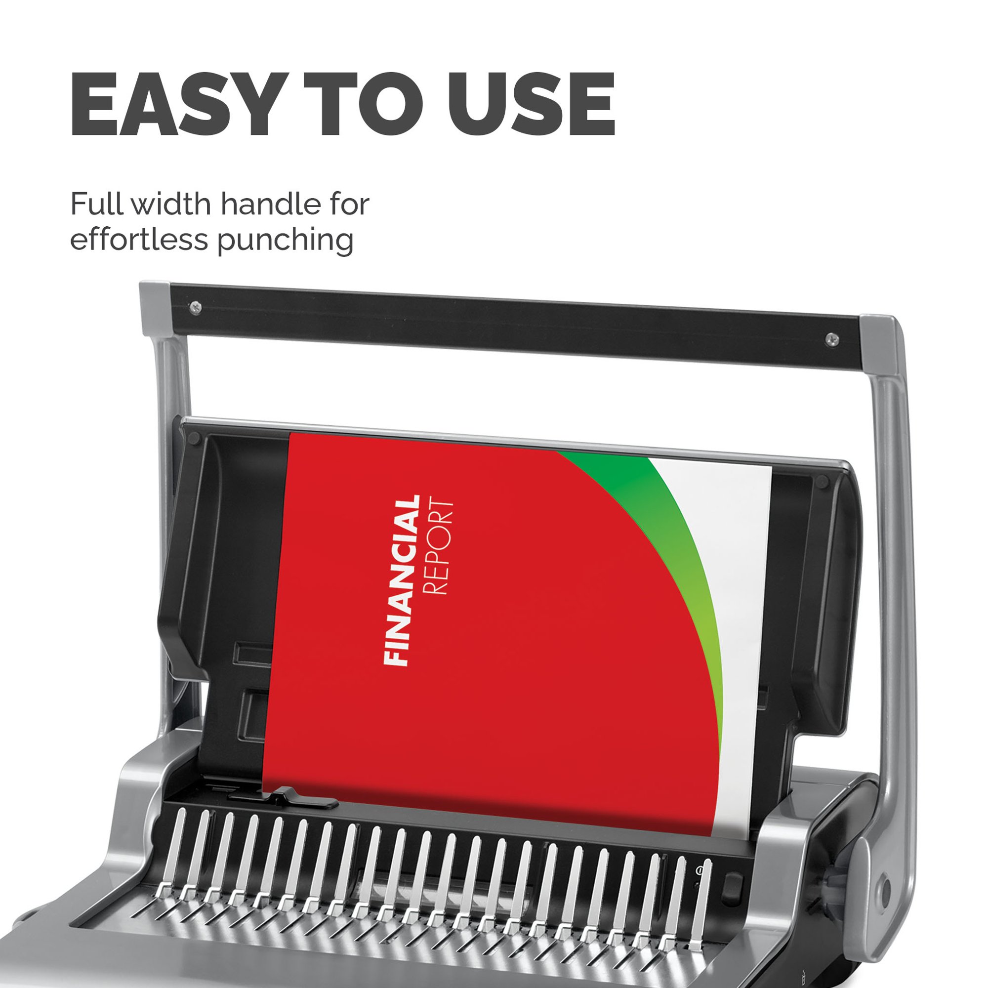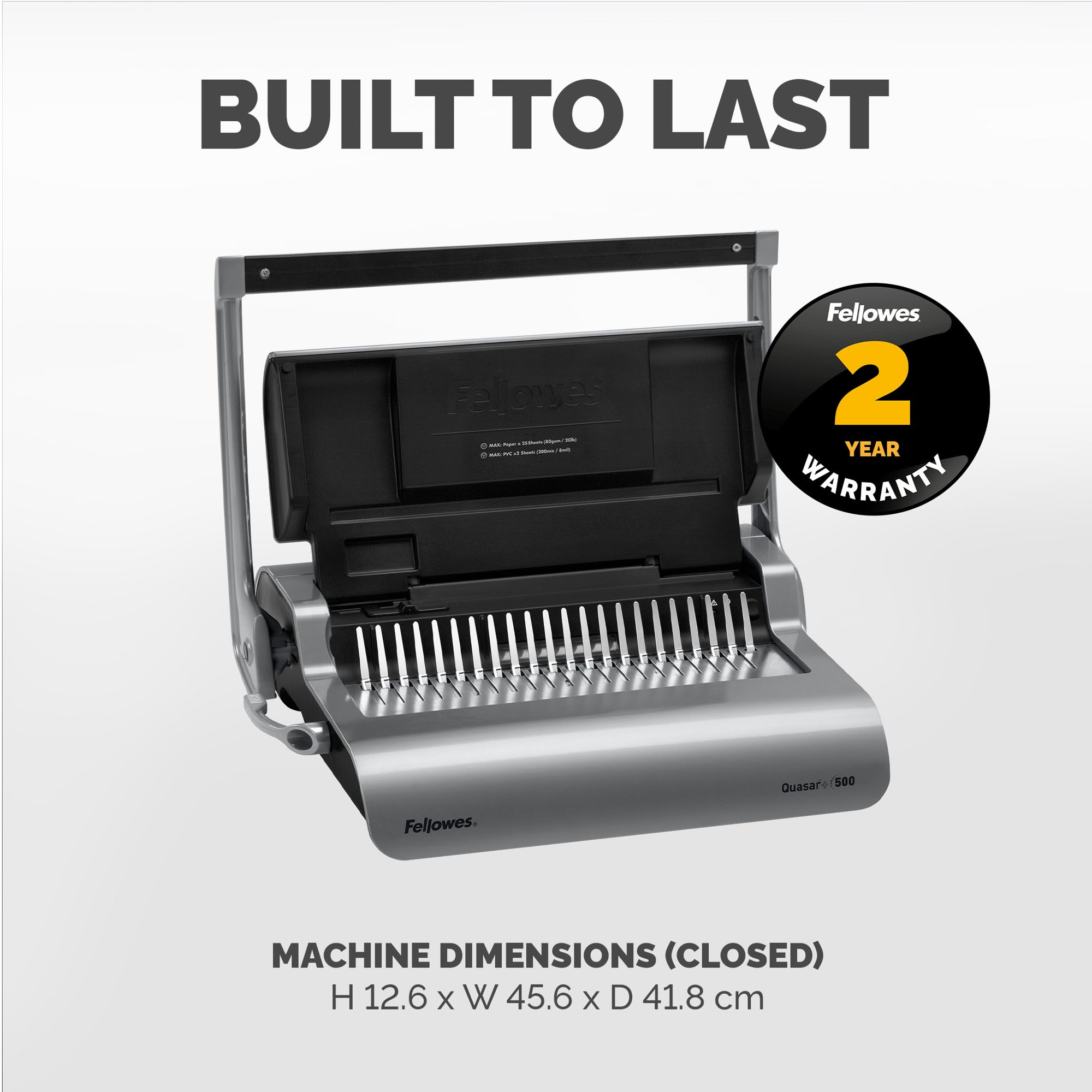 The Quasar +500 Manual Comb Binder comes with a range of innovative, user- friendly features that allow the user to work smarter and quicker, making it ideal for the office and frequent use. The Quasar 500 has a punch capacity of up to 25 sheets and a bind capacity of 500.Comes with the full width punch handle for effortless punching. As with all Fellowes comb binders the Quasar 500 also comes with the angled comb rake to make loading punched sheets easier and smoother, whilst vertical sheet loading and adjustable edge guide improve punch accuracy.This practical machine comes with a storage tray with patented comb and document measure for quick selection of the correct size supplies and a handy chip tray that automatically bursts open when full to eliminate jams. The fold down lid means the machine is easily stored away when not in use. For the ultimate professional finish add style and colour to your documents through a wide range of Fellowes covers and combs. Includes starter kit for binding 10 documents and comes with a 2 year warranty