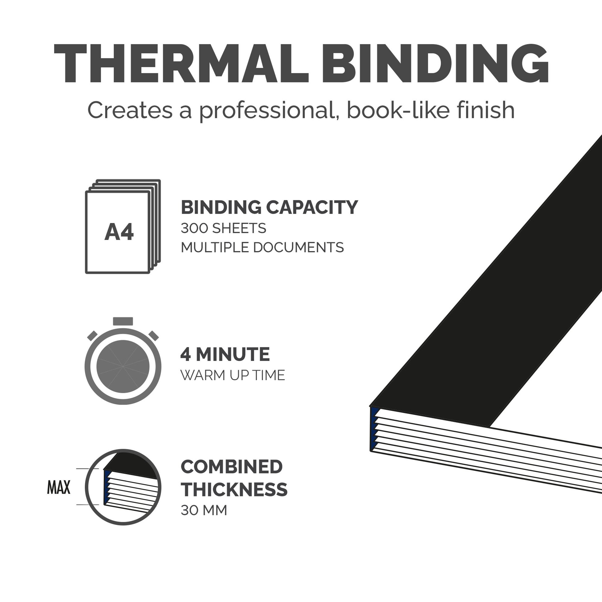 The Fellowes Helios 30 Office Thermal Binder is quick, convenient and has advanced safety features making it ideal for frequent use in the office. This thermal binder enables you to create a high quality 'book-like'finish to your documents. Multiple documents up to 300 sheets (30mm) can be bound simultaneously. Helios 30 comes with the advanced safety feature HeatShield. HeatShield is a safety barrier that prevents accidental contact with the heating plate and a Sleep mode mechanism is operated after 30 minutes of inactivity. The document size guide enables the user to easily select the correct binding cycle for each different sized document. Includes a variable binding cycle feature to easily bind documents of different thicknesses. Audio and visual indicators clearly signal when ready to bind. Folds flat for storage and features a cooling rack at rear. Comes with a 2 year warranty.