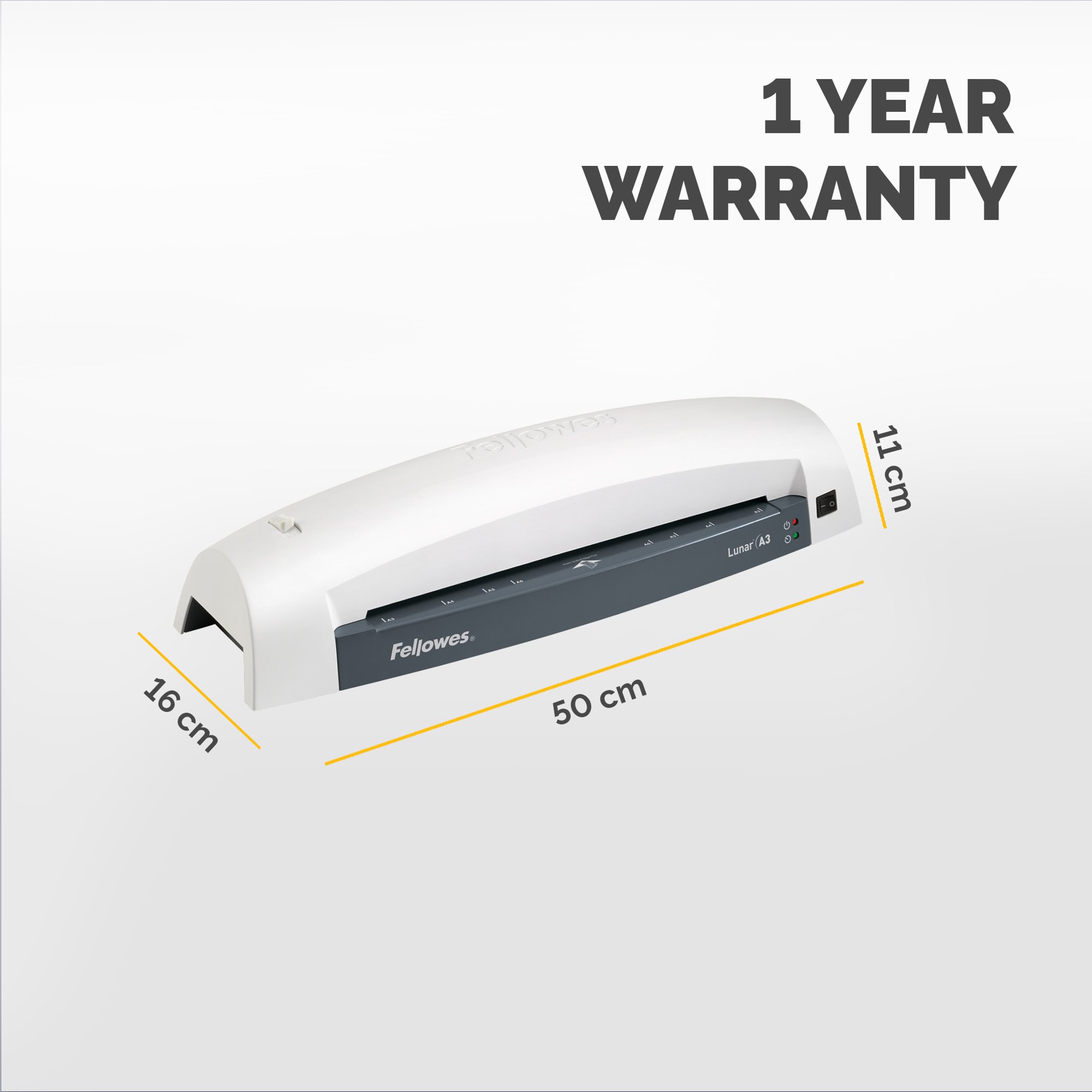 Get creative with the Fellowes Lunar A3 home laminator. This easy to use A3 laminator is perfect for all your personal or family hobby and craft projects, but when it comes to laminating the possibilities are truly endless! Discover how laminating can make the colours come alive on photos or preserve your children€™s precious artwork for years to come. The Lunar A3 has been designed for occasional home use and offers 100% Jam Free performance when used with Fellowes branded pouches for that perfect finish in your own home. The release trigger makes it easy to retrieve and realign mis-fed pouches and the double pouch setting (80 & 125 microns) as well as visual (LED light) indicators ensure easy to understand, simple laminating. Suitable for use with Fellowes Enhance 80 & Capture 125 micron pouches. Comes with a 1 year warranty.