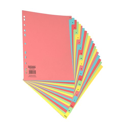 Neatly file and organise documents with these bright and attractive subject dividers. Each divider is made from sturdy manilla in 5 alternating pastel colours with A-Z printed tabs for a simple alphabetical filing system and multipunched to fit almost any standard A4 ring binder or lever arch file.