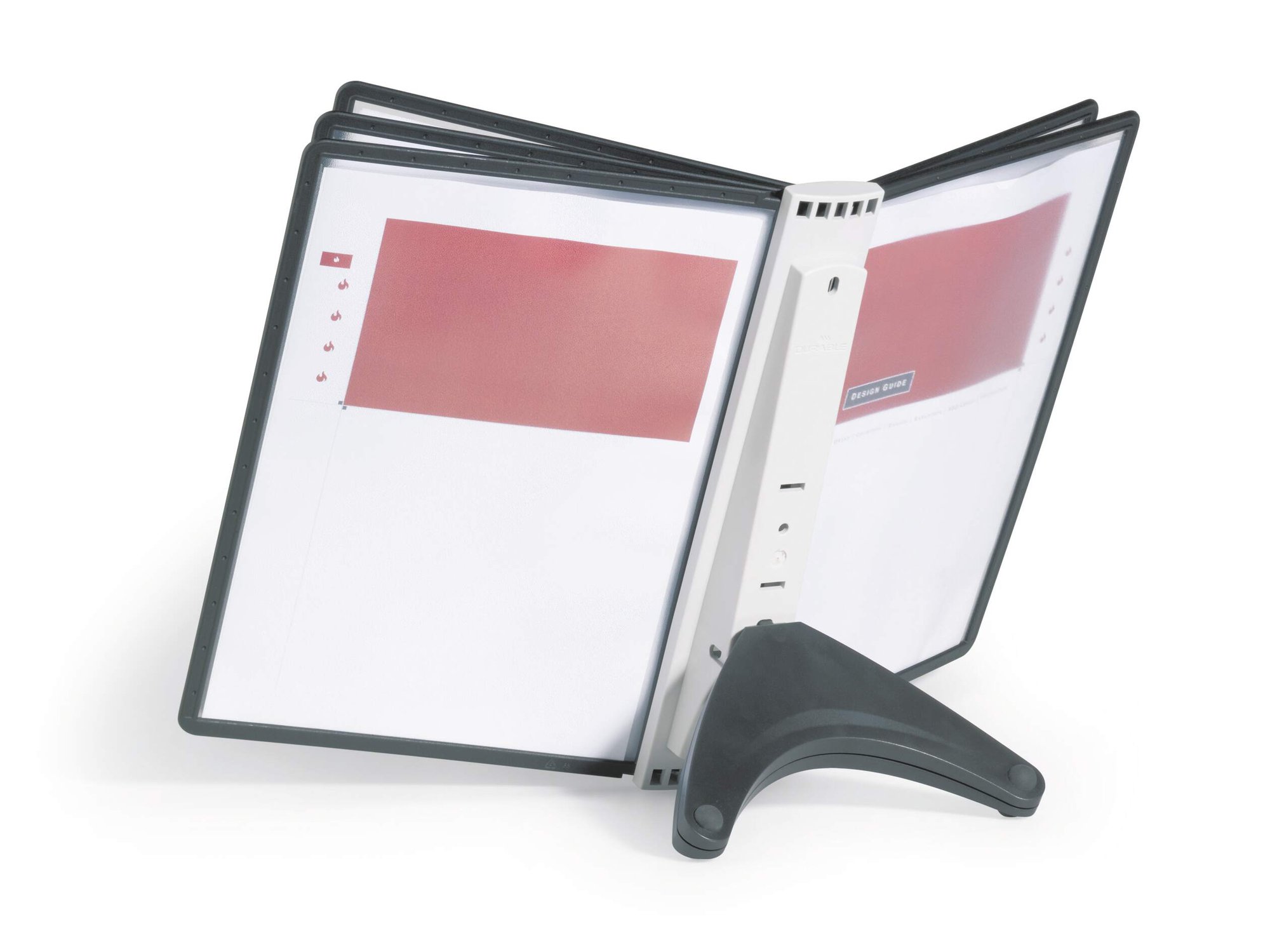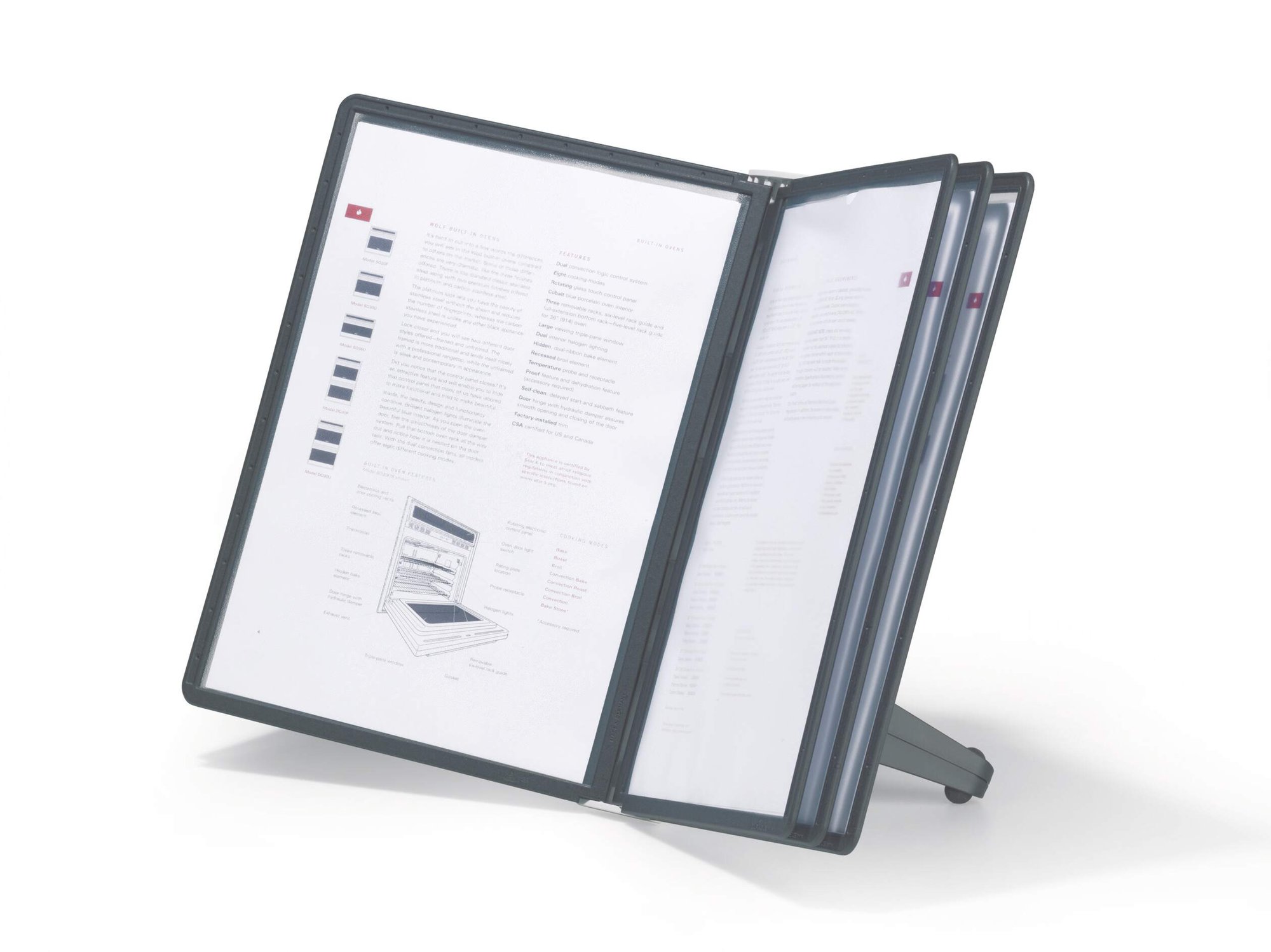 The DURABLE SHERPA range is a stylish display panel system range with a sturdy base. Perfect for use in a showroom, office, etc. This desk unit includes 5 black A4 double sided panels for holding up to 10 documents. The panels are anti-glare and copy-proof which makes it easy to use.<br><br>Great for holding price lists, product information, frequently used telephone numbers, etc.