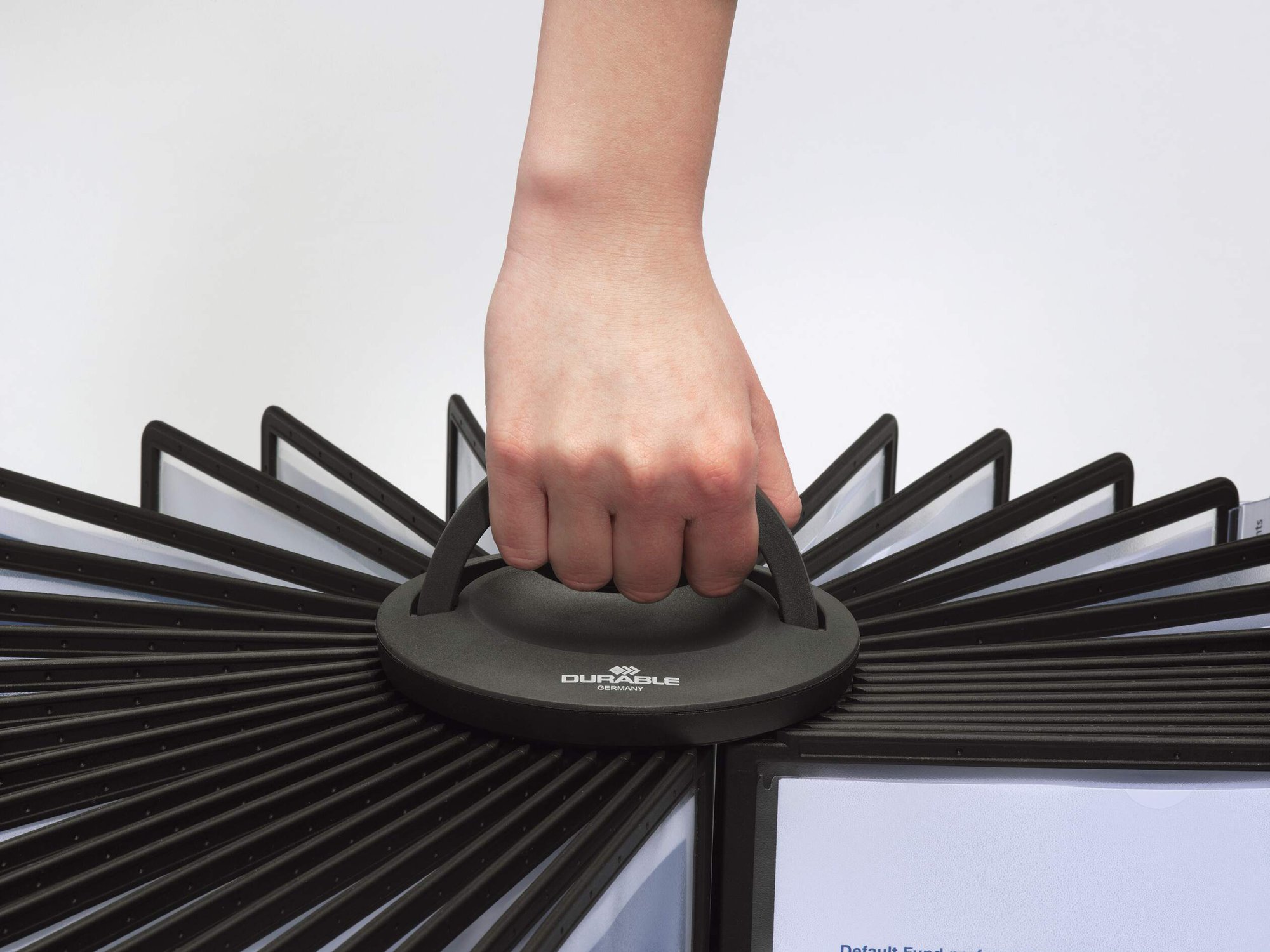 The DURABLE SHERPA Carousel Table 40 is a versatile rotating display system that comes Compatiblelete with 40 black A4 display panels and 40 index tabs. It features a weighted, non-slip base for stability, and a small handle at the top for easy relocation and smooth rotation of the panels.<br><br>This convenient system ensures quick access to a wide range of information, with panels that are simple to insert and remove, making it an ideal solution for organising and displaying important documents in any workspace.<br><br>5 year warranty<br>Included panels: 40<br><br>Made in Germany