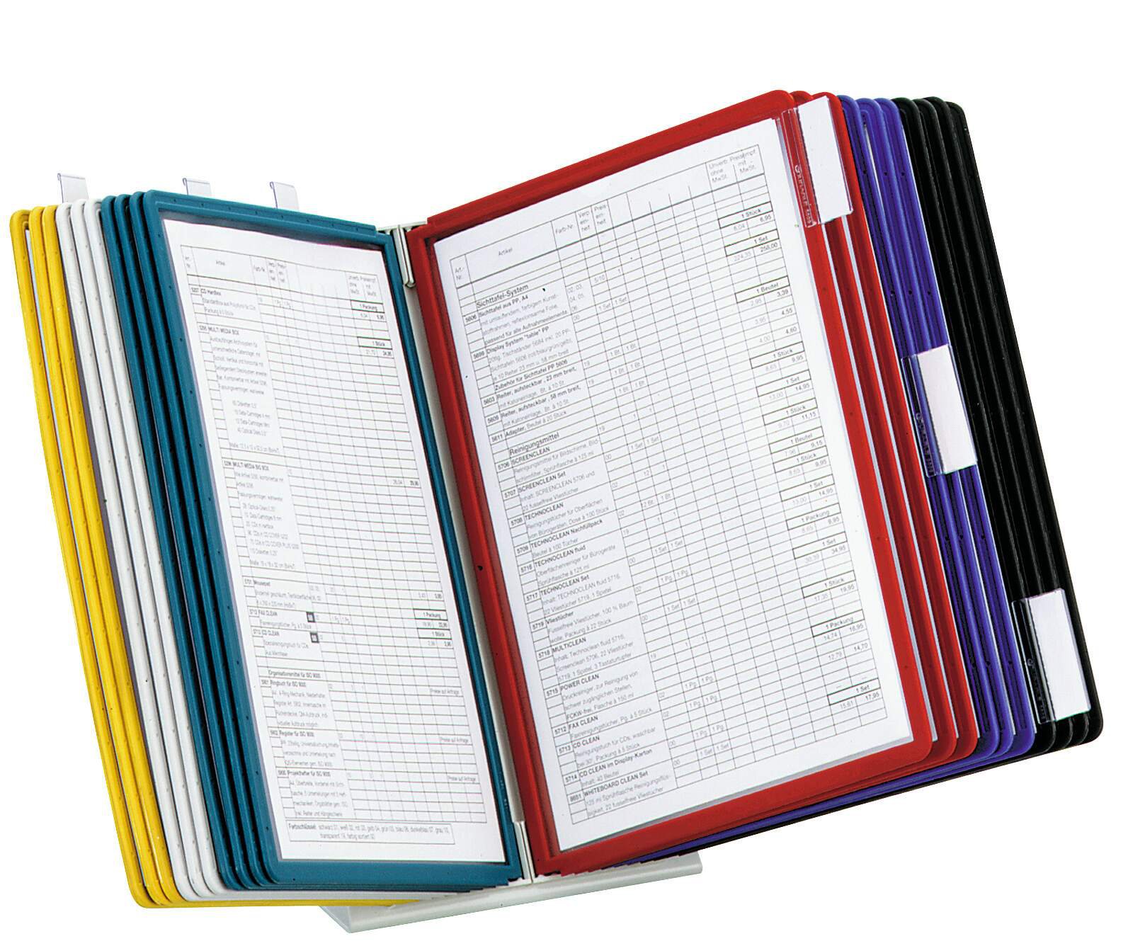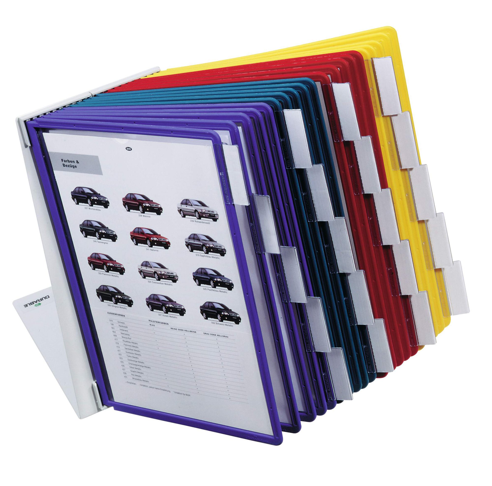 The DURABLE VARIO range is a robust and economical display panel system with a sturdy metal base. Ideal for use in industrial areas and offices. This desk unit includes 20 A4 display panels and tabs.<br><br>The panels are anti-glare and copy-proof which makes it easy to use. Great for holding health and safety instructions, machine manuals, etc.
