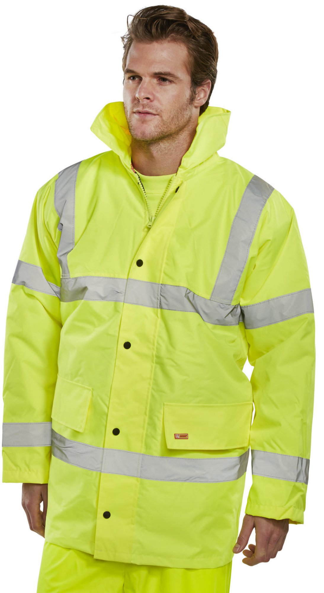 PU coated polyester. Quilted lining with heavy weight (160gsm) polyester filling. Concealed hood. Two-way heavy duty zip front with storm flap and security pocket. 2 Lower pockets with flaps. In side breast pocket. Knitted storm cuffs. Internal 'Wicking' strip. Fully taped seams. Reflective Material. , Conforms to EN ISO 20471 Class 3 High Visibility, Conforsm to EN 343 Class 3 Water Penetration Class 1 Air Permeability