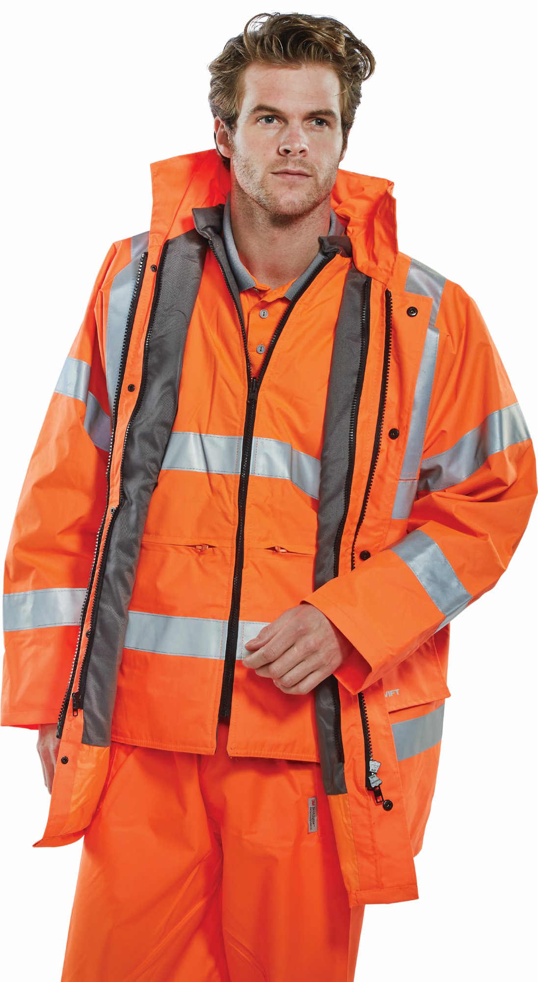 Outer Jacket -, Conforms to EN ISO 20471 Class 3 High Visibility, Conforms to EN343 Class 3 Water Penetration Class 1 Air Permeability, GO/RT 3279 - Railway use certified, Heavyweight PU coated polyester. Nylon lining. Concealed hood. Two-way heavy weight zip with storm flap. 2 Lower hip pockets with flaps. Knitted storm cuffs. Fully taped seams. Inner Bodywarmer -, EN ISO20471 Class 2 High Visibility, PU coating to hi-vis side. Reversible bodywarmer 'zipout'. Knitted collar. Heavy duty zip. Grey polycotton lining on reverse. 2 zipped pockets on both sides. Mobile phone Compatibleartment on quilted side. Fully taped seams. Reflective Material.