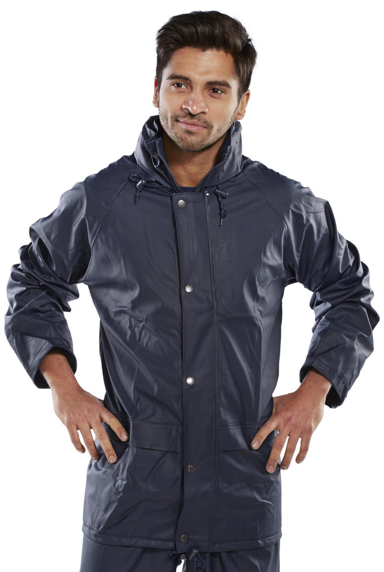 Polyester with PU coating, Concealed hood, Full zip front with double storm flap, Self double yoke back, Lower pockets with flap, Elasticated wind cuffs, Stitched and welded seams