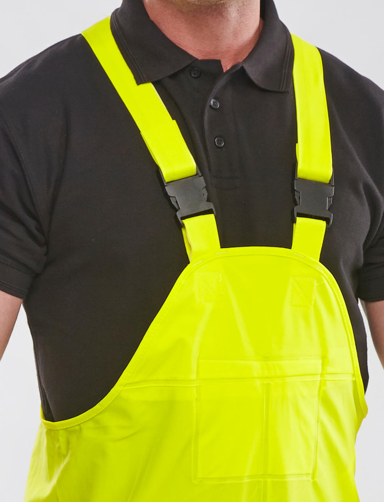Polyester with PU coating, Adjustable elasticated braces with quick release buckles, Internal bib pocket with zipped entry, Side waist expension for easy €on-off€, 25cm zips at ankles with hook and loop tab closure, Stitched and welded seams
