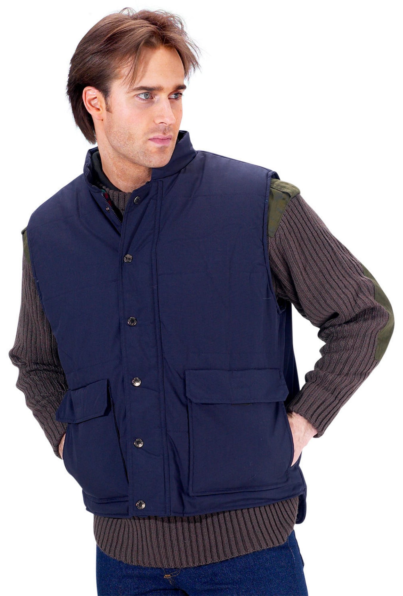 Quilted Polycotton bodywarmer, Stud and zip front, Stand-up collar, Elasticated armholes, 2 patch pockets with hook and loop fastening flaps and side access, Attractive brushed check cotton flannel lining, 1 inside patch pocket with flap