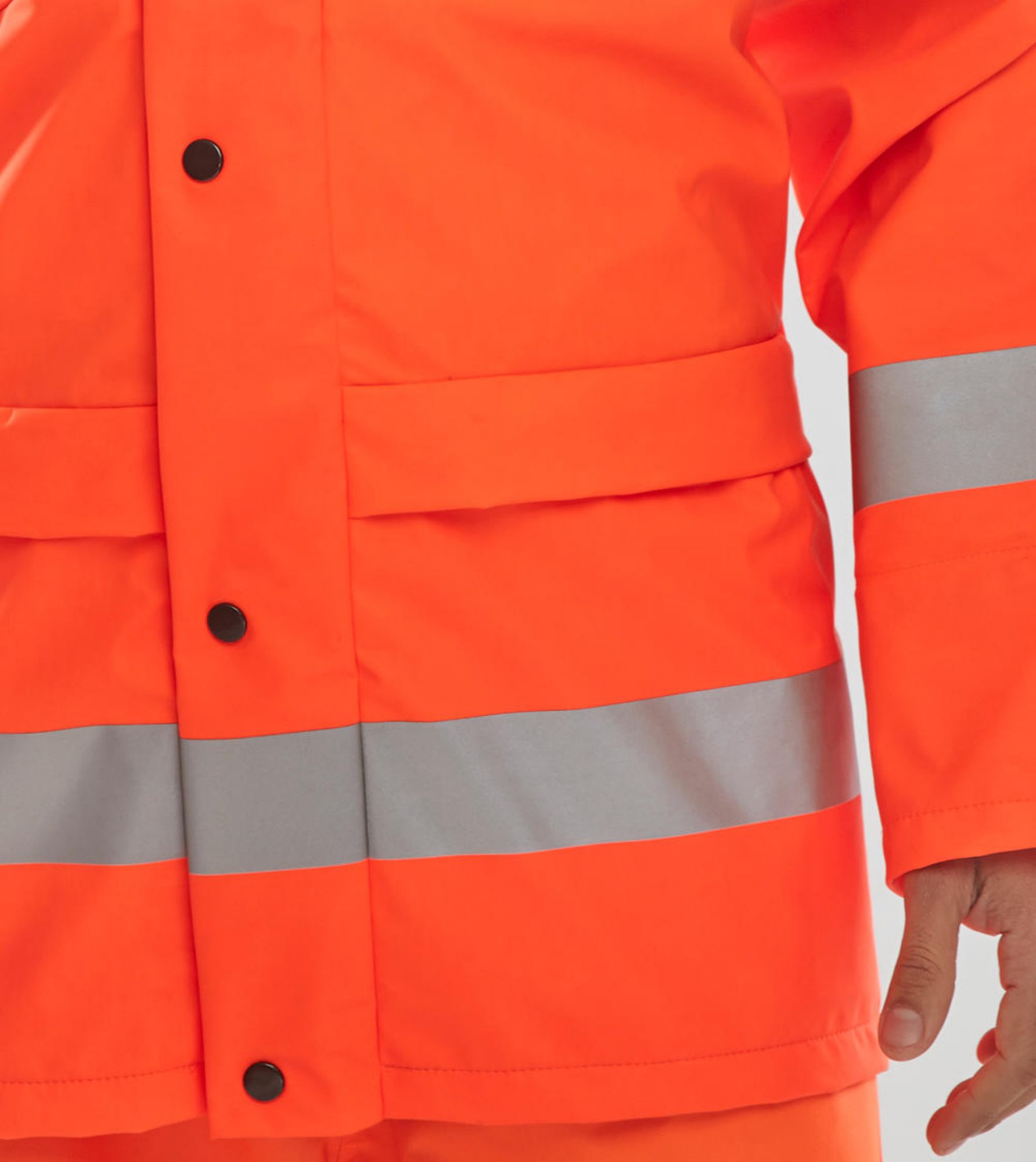 Breathable fabric. Polyester with PU coating. Concealed hood. Full zip front with double storm flap. Self double yoke back. Lower pockets with flap. Elasticated storm cuffs. Stitched and welded seams. Reflective material. EN ISO20471 Class 3 High Visibility, EN343 Class 3 Resistance to Water Penetration Class 1 Air Permeability